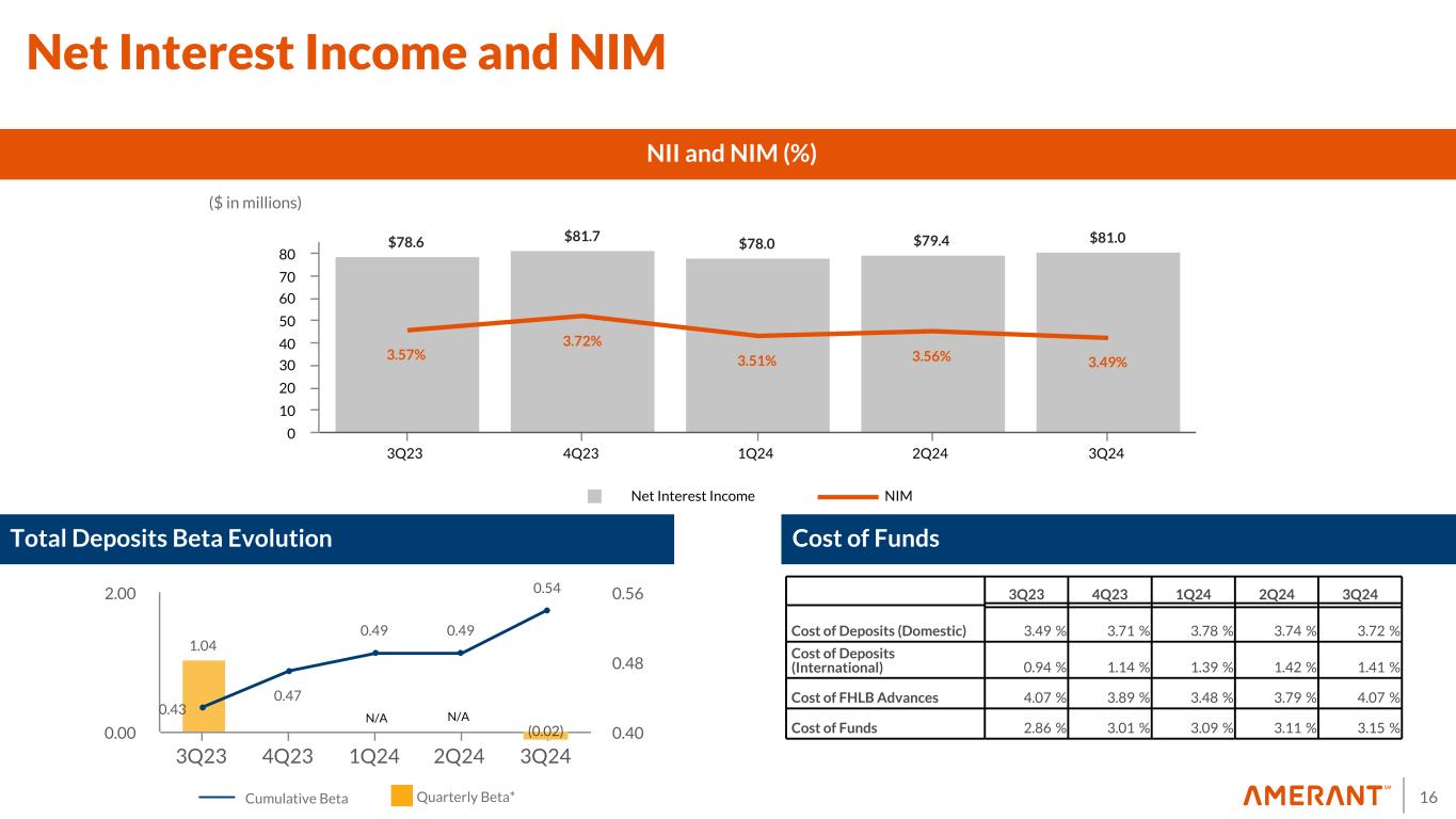 15 $7,547 $7,895 $7,878 $7,816 $8,111 $3,861 $4,153 $4,236 $4,040 $4,225 $1,580 $1,578 $1,595 $1,611 $1,702 $736 $737 $650 $700 $702 $1,370 $1,427 $1,397 $1,465 $1,482 2.66% 2.88% 3.00% 2.98% 2.99% 3Q23 4Q23 1Q24 2Q24 3Q24 0 1,000 2,000 3,000 4,000 5,000 6,000 7,000 8,000 $2,494 $2,423 $2,465 $2,558 2021 2022 2023 3Q24 1,000 2,000 3,000 $3,137 $4,621 $5,430 $5,553 2021 2022 2023 3Q24 2,500 5,000 Domestic Deposits ($ in millions) Deposit Composition International Deposits ($ in millions) Mix by Country of Domicile Transaction Deposits Customer CDs Brokered Deposits Cost of total Deposits ($ in millions) Noninterest Bearing Demand Deposits 32% of Total Deposits Approx. avg. acct balance: $45,000 68% of Total Deposits Approx. avg. acct balance: $110,000 Well Diversified and Stable Deposit Mix