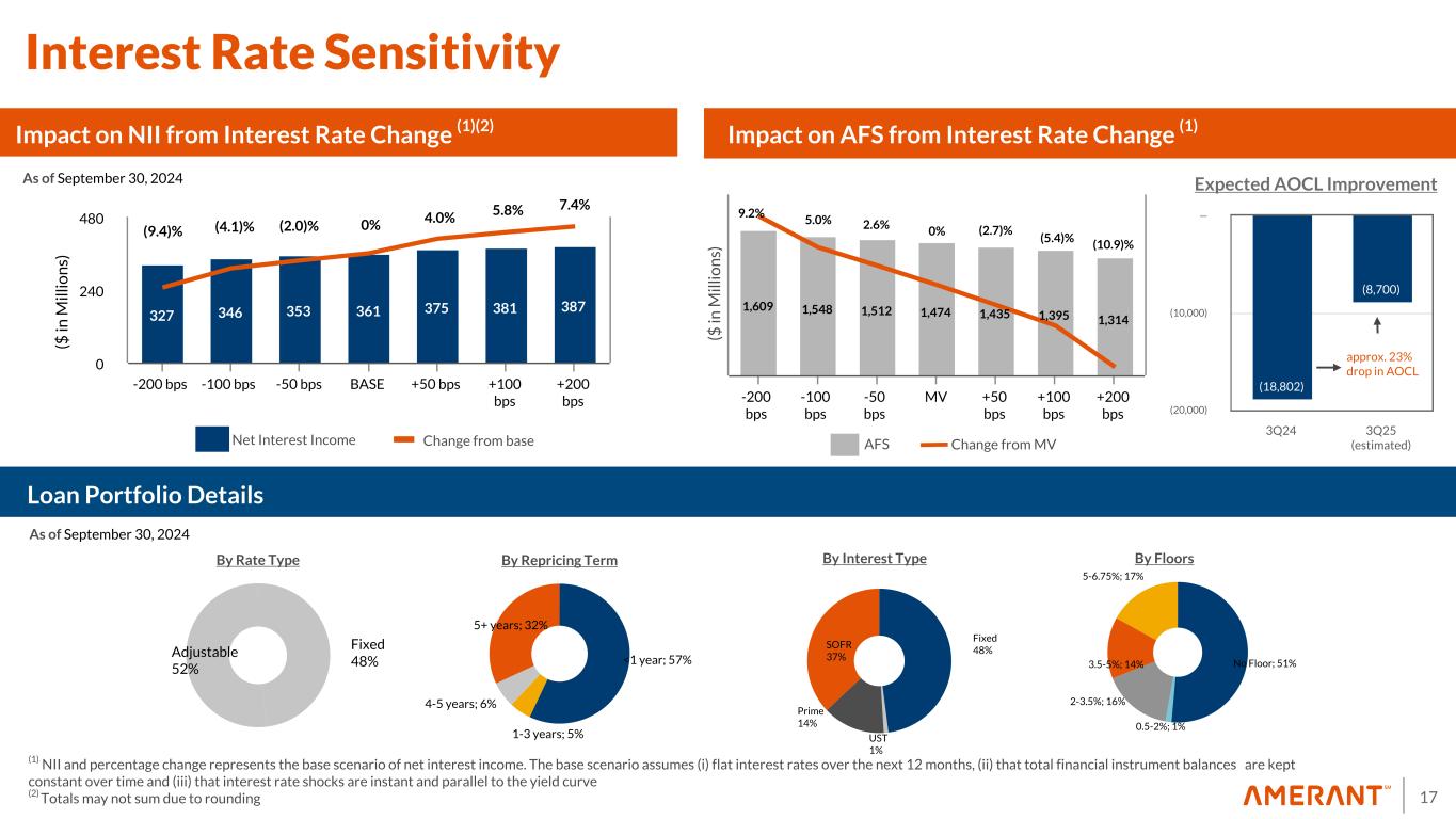 16 $78.6 $81.7 $78.0 $79.4 $81.0 3.57% 3.72% 3.51% 3.56% 3.49% Net Interest Income NIM 3Q23 4Q23 1Q24 2Q24 3Q24 0 10 20 30 40 50 60 70 80 NII and NIM (%) 16 ($ in millions) 3Q23 4Q23 1Q24 2Q24 3Q24 Cost of Deposits (Domestic) 3.49 % 3.71 % 3.78 % 3.74 % 3.72 % Cost of Deposits (International) 0.94 % 1.14 % 1.39 % 1.42 % 1.41 % Cost of FHLB Advances 4.07 % 3.89 % 3.48 % 3.79 % 4.07 % Cost of Funds 2.86 % 3.01 % 3.09 % 3.11 % 3.15 % 1.04 0.43 0.47 0.49 0.49 0.54 3Q23 4Q23 1Q24 2Q24 3Q24 0.00 2.00 0.40 0.48 0.56 Quarterly Beta*Cumulative Beta Net Interest Income and NIM Total Deposits Beta Evolution Cost of Funds N/AN/A (0.02)