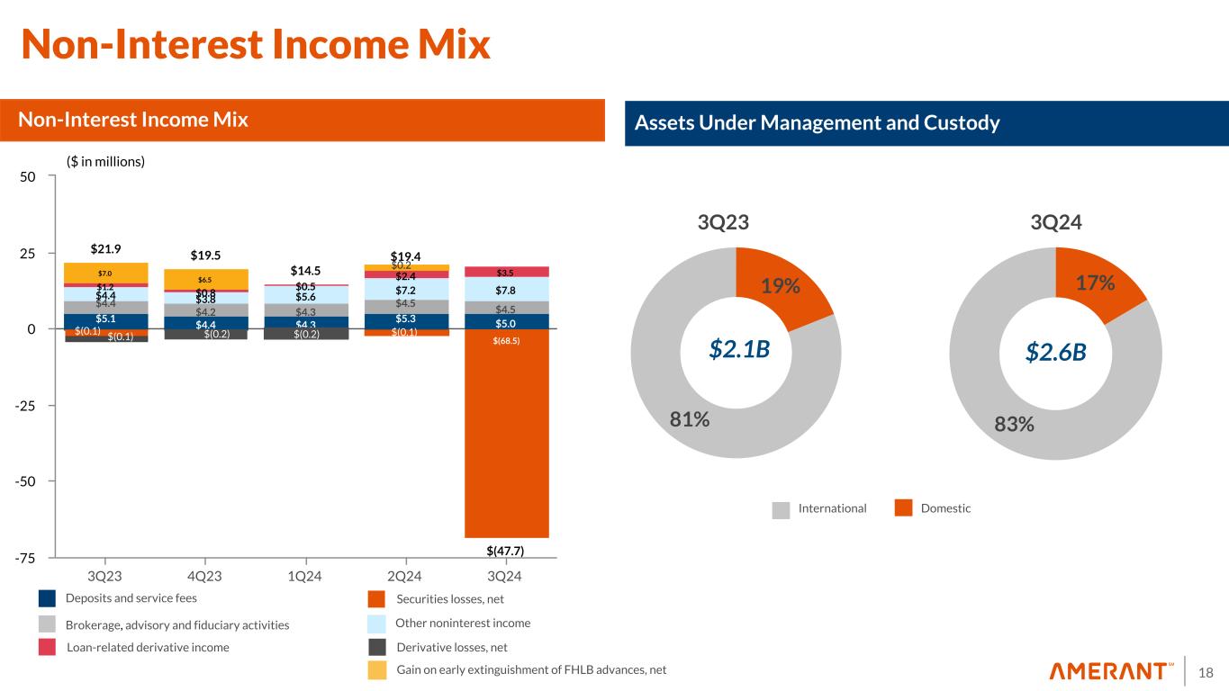 17 <1 year; 57% 1-3 years; 5% 4-5 years; 6% 5+ years; 32% 327 346 353 361 375 381 387 -200 bps -100 bps -50 bps BASE +50 bps +100 bps +200 bps 0 240 480 As of September 30, 2024 Fixed 48% Adjustable 52% 17 By Interest TypeBy Rate Type By Repricing Term (1) NII and percentage change represents the base scenario of net interest income. The base scenario assumes (i) flat interest rates over the next 12 months, (ii) that total financial instrument balances are kept constant over time and (iii) that interest rate shocks are instant and parallel to the yield curve (2) Totals may not sum due to rounding Loan Portfolio Details Impact on NII from Interest Rate Change (1)(2) AFSChange from base ($ in M ill io n s) Fixed 48% UST 1% Prime 14% SOFR 37% As of September 30, 2024 Impact on AFS from Interest Rate Change (1) (9.4)% (4.1)% 0% 5.8%4.0% (2.0)% 7.4% No Floor; 51% 0.5-2%; 1% 2-3.5%; 16% 3.5-5%; 14% 5-6.75%; 17% By Floors 1,609 1,548 1,512 1,474 1,435 1,395 1,314 -200 bps -100 bps -50 bps MV +50 bps +100 bps +200 bps ($ in M ill io n s) 9.2% 5.0% 2.6% 0% (2.7)% (5.4)% (10.9)% Expected AOCL Improvement Change from MVNet Interest Income (18,802) (8,700) 3Q24 3Q25 (estimated) (20,000) (10,000) — approx. 23% drop in AOCL Interest Rate Sensitivity