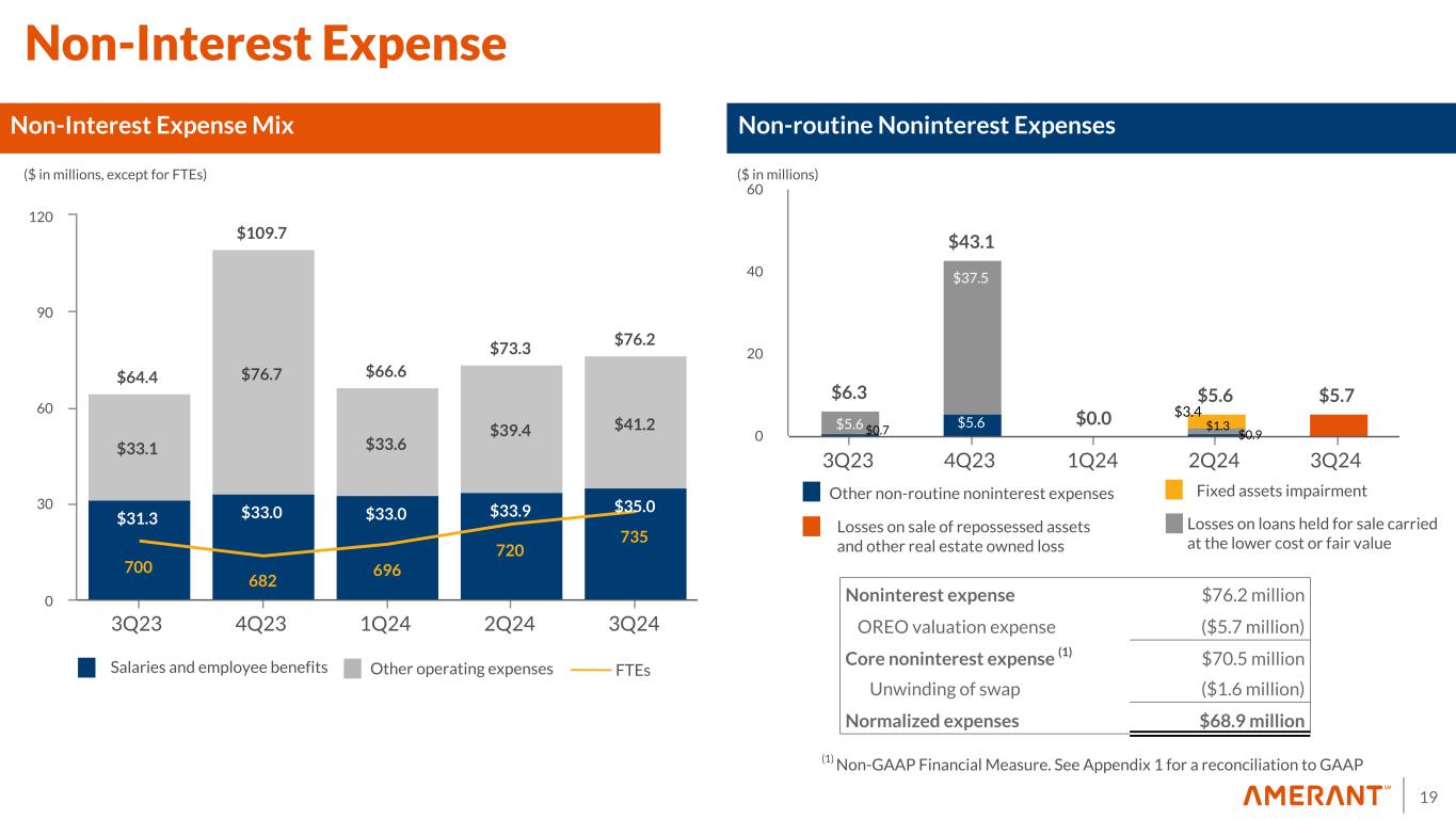 18 $21.9 $19.5 $14.5 $19.4 $(47.7) $5.1 $4.4 $4.3 $5.3 $5.0 $4.4 $4.2 $4.3 $4.5 $4.5 $(68.5) $4.4 $3.8 $5.6 $7.2 $7.8$1.2 $0.8 $0.5 $2.4 $3.5$7.0 $6.5 3Q23 4Q23 1Q24 2Q24 3Q24 -75 -50 -25 0 25 50 19% 81% 17% 83% Non-Interest Income Mix Deposits and service fees Brokerage, advisory and fiduciary activities Other noninterest income DomesticInternational 3Q23 $2.6B ($ in millions) Securities losses, net Loan-related derivative income Derivative losses, net Gain on early extinguishment of FHLB advances, net Non-Interest Income Mix $2.1B Assets Under Management and Custody 3Q24 $(0.2) $(0.1) $(0.1) $(0.2) $(0.2) $0.2 $(0.1)