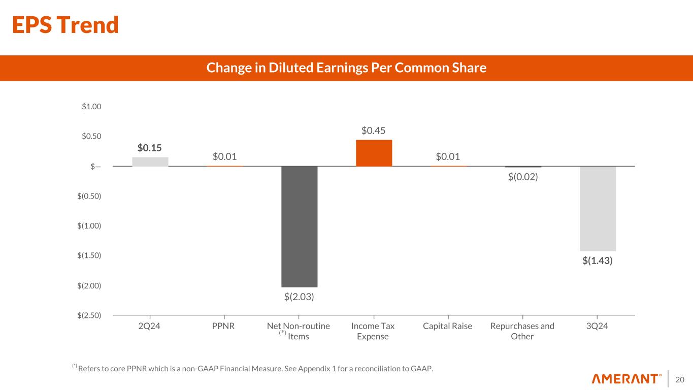 19 $64.4 $109.7 $66.6 $73.3 $76.2 $31.3 $33.0 $33.0 $33.9 $35.0 $33.1 $76.7 $33.6 $39.4 $41.2 700 682 696 720 735 3Q23 4Q23 1Q24 2Q24 3Q24 0 30 60 90 120 Non-Interest Expense Mix ($ in millions, except for FTEs) Non-routine Noninterest Expenses $6.3 $43.1 $0.0 $5.6 $5.7 $5.6$5.6 $37.5 3Q23 4Q23 1Q24 2Q24 3Q24 0 20 40 60 ($ in millions) Non-Interest Expense Salaries and employee benefits Other operating expenses FTEs Other non-routine noninterest expenses Losses on loans held for sale carried at the lower cost or fair value Fixed assets impairment $0.9 $1.3 $3.4 Noninterest expense $76.2 million OREO valuation expense ($5.7 million) Core noninterest expense (1) $70.5 million Unwinding of swap ($1.6 million) Normalized expenses $68.9 million (1) Non-GAAP Financial Measure. See Appendix 1 for a reconciliation to GAAP Losses on sale of repossessed assets and other real estate owned loss $0.7