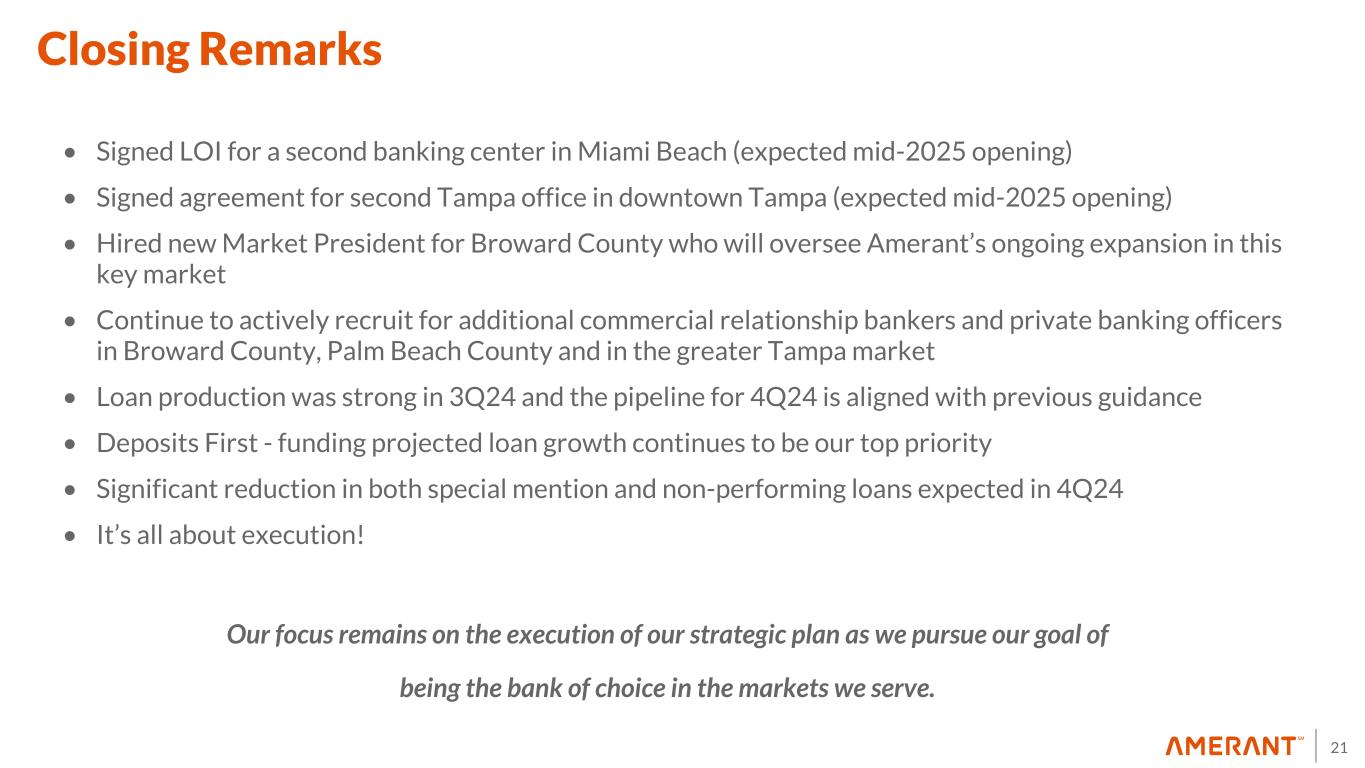 20 Change in Diluted Earnings Per Common Share $0.15 $0.01 $(2.03) $0.45 $0.01 $(0.02) $(1.43) 2Q24 PPNR Net Non-routine Items Income Tax Expense Capital Raise Repurchases and Other 3Q24 $(2.50) $(2.00) $(1.50) $(1.00) $(0.50) $— $0.50 $1.00 EPS Trend (*) Refers to core PPNR which is a non-GAAP Financial Measure. See Appendix 1 for a reconciliation to GAAP. (*)