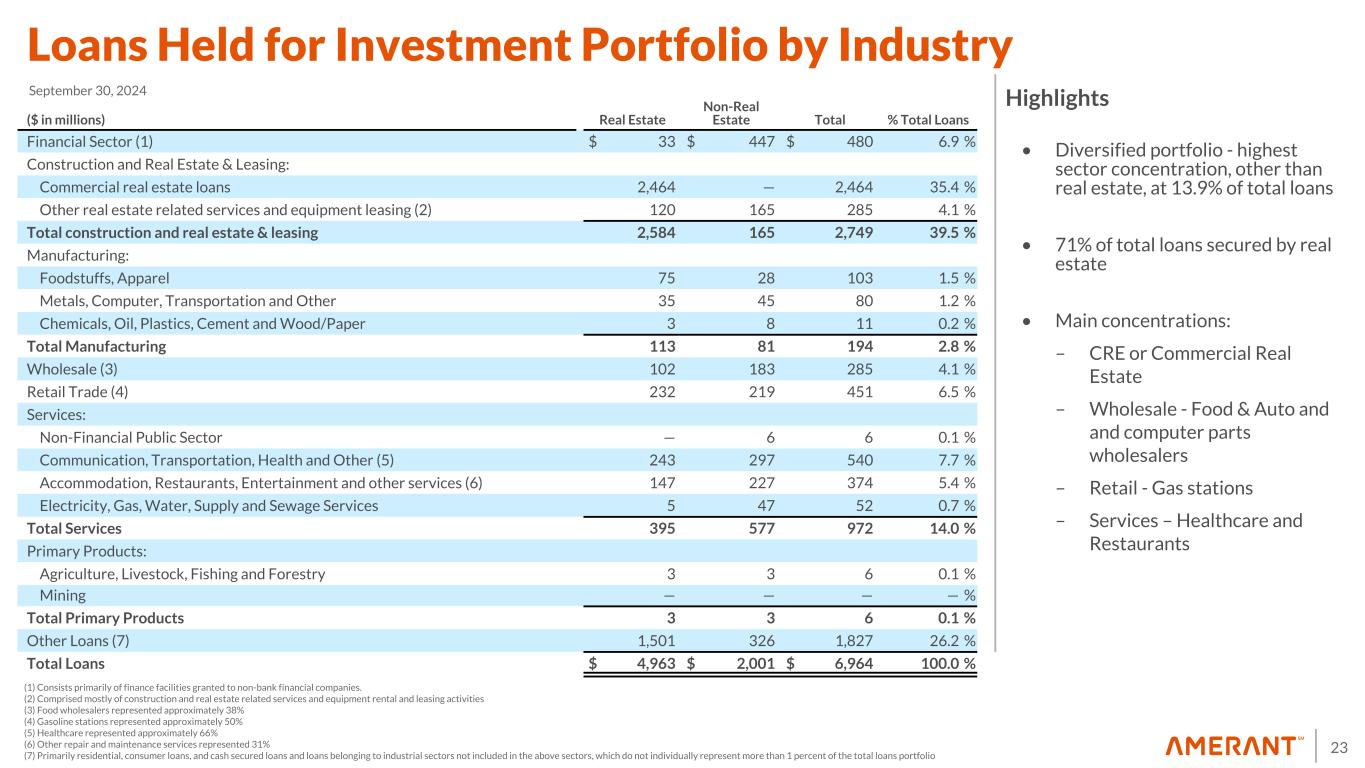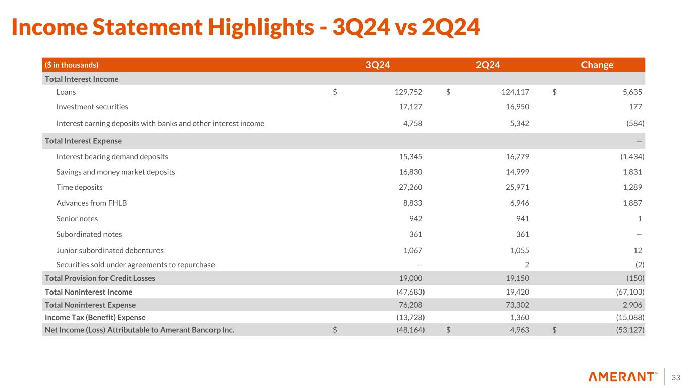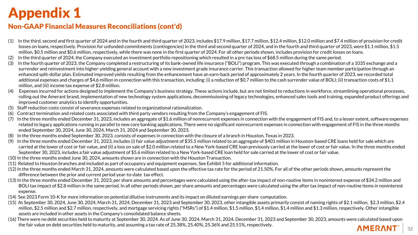 32 Appendix 1 Non-GAAP Financial Measures Reconciliations (cont'd) (1) In the third, second and first quarter of 2024 and in the fourth and third quarter of 2023, includes $17.9 million, $17.7 million, $12.4 million, $12.0 million and $7.4 million of provision for credit losses on loans, respectively. Provision for unfunded commitments (contingencies) in the third and second quarter of 2024, and in the fourth and third quarter of 2023, were $1.1 million, $1.5 million, $0.5 million and $0.6 million, respectively, while there was none in the first quarter of 2024. For all other periods shown, includes provision for credit losses on loans. (2) In the third quarter of 2024, the Company executed an investment portfolio repositioning which resulted in a pre-tax loss of $68.5 million during the same period. (3) In the fourth quarter of 2023, the Company completed a restructuring of its bank-owned life insurance (“BOLI”) program. This was executed through a combination of a 1035 exchange and a surrender and reinvestment into higher-yielding general account with a new investment grade insurance carrier. This transaction allowed for higher team member participation through an enhanced split-dollar plan. Estimated improved yields resulting from the enhancement have an earn-back period of approximately 2 years. In the fourth quarter of 2023, we recorded total additional expenses and charges of $4.6 million in connection with this transaction, including: (i) a reduction of $0.7 million to the cash surrender value of BOLI; (ii) transaction costs of $1.1 million, and (iii) income tax expense of $2.8 million. (4) Expenses incurred for actions designed to implement the Company’s business strategy. These actions include, but are not limited to reductions in workforce, streamlining operational processes, rolling out the Amerant brand, implementation of new technology system applications, decommissioning of legacy technologies, enhanced sales tools and training, expanded product offerings and improved customer analytics to identify opportunities. (5) Staff reduction costs consist of severance expenses related to organizational rationalization. (6) Contract termination and related costs associated with third party vendors resulting from the Company’s engagement of FIS. (7) In the three months ended December 31, 2023, includes an aggregate of $1.6 million of nonrecurrent expenses in connection with the engagement of FIS and, to a lesser extent, software expenses related to legacy applications running in parallel to new core banking applications. There were no significant nonrecurrent expenses in connection with engagement of FIS in the three months ended September 30, 2024, June 30, 2024, March 31, 2024 and September 30, 2023. (8) In the three months ended September 30, 2023, consists of expenses in connection with the closure of a branch in Houston, Texas in 2023. (9) In the three months ended December 31, 2023, includes (i) fair value adjustment of $35.5 million related to an aggregate of $401 million in Houston-based CRE loans held for sale which are carried at the lower of cost or fair value, and (ii) a loss on sale of $2.0 million related to a New York-based CRE loan previously carried at the lower of cost or fair value. In the three months ended September 30, 2023, includes a fair value adjustment of $5.6 million related to a New York-based CRE loan held for sale carried at the lower of cost or fair value. (10) In the three months ended June 30, 2024, amounts shown are in connection with the Houston Transaction. (11) Related to Houston branches and included as part of occupancy and equipment expenses. See Exhibit 5 for additional information. (12) In the three months ended March 31, 2024, amounts were calculated based upon the effective tax rate for the period of 21.50%. For all of the other periods shown, amounts represent the difference between the prior and current period year-to-date tax effect. (13) In the three months ended December 31, 2023, per share amounts and percentages were calculated using the after-tax impact of non-routine items in noninterest expense of $34.2 million and BOLI tax impact of $2.8 million in the same period. In all other periods shown, per share amounts and percentages were calculated using the after tax impact of non-routine items in noninterest expense. (14) See 2023 Form 10-K for more information on potential dilutive instruments and its impact on diluted earnings per share computation. (15) At September 30, 2024, June 30, 2024, March 31, 2024, December 31, 2023 and September 30, 2023, other intangible assets primarily consist of naming rights of $2.1 million, $2.3 million, $2.4 million, $2.5 million and $2.7 million, respectively, and mortgage servicing rights (“MSRs”) of $1.4 million, $1.5 million, $1.4 million, $1.4 million and $1.3 million, respectively. Other intangible assets are included in other assets in the Company’s consolidated balance sheets. (16) There were no debt securities held to maturity at September 30, 2024. As of June 30, 2024, March 31, 2024, December 31, 2023 and September 30, 2023, amounts were calculated based upon the fair value on debt securities held to maturity, and assuming a tax rate of 25.38%, 25.40%, 25.36% and 25.51%, respectively.