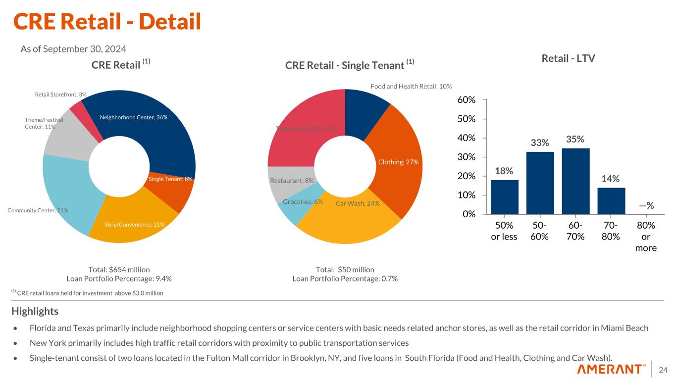 23 Loans Held for Investment Portfolio by Industry • Diversified portfolio - highest sector concentration, other than real estate, at 13.9% of total loans • 71% of total loans secured by real estate • Main concentrations: – CRE or Commercial Real Estate – Wholesale - Food & Auto and and computer parts wholesalers – Retail - Gas stations – Services – Healthcare and Restaurants Highlights (1) Consists primarily of finance facilities granted to non-bank financial companies. (2) Comprised mostly of construction and real estate related services and equipment rental and leasing activities (3) Food wholesalers represented approximately 38% (4) Gasoline stations represented approximately 50% (5) Healthcare represented approximately 66% (6) Other repair and maintenance services represented 31% (7) Primarily residential, consumer loans, and cash secured loans and loans belonging to industrial sectors not included in the above sectors, which do not individually represent more than 1 percent of the total loans portfolio ($ in millions) Real Estate Non-Real Estate Total % Total Loans Financial Sector (1) $ 33 $ 447 $ 480 6.9 % Construction and Real Estate & Leasing: Commercial real estate loans 2,464 — 2,464 35.4 % Other real estate related services and equipment leasing (2) 120 165 285 4.1 % Total construction and real estate & leasing 2,584 165 2,749 39.5 % Manufacturing: Foodstuffs, Apparel 75 28 103 1.5 % Metals, Computer, Transportation and Other 35 45 80 1.2 % Chemicals, Oil, Plastics, Cement and Wood/Paper 3 8 11 0.2 % Total Manufacturing 113 81 194 2.8 % Wholesale (3) 102 183 285 4.1 % Retail Trade (4) 232 219 451 6.5 % Services: Non-Financial Public Sector — 6 6 0.1 % Communication, Transportation, Health and Other (5) 243 297 540 7.7 % Accommodation, Restaurants, Entertainment and other services (6) 147 227 374 5.4 % Electricity, Gas, Water, Supply and Sewage Services 5 47 52 0.7 % Total Services 395 577 972 14.0 % Primary Products: Agriculture, Livestock, Fishing and Forestry 3 3 6 0.1 % Mining — — — — % Total Primary Products 3 3 6 0.1 % Other Loans (7) 1,501 326 1,827 26.2 % Total Loans $ 4,963 $ 2,001 $ 6,964 100.0 % September 30, 2024