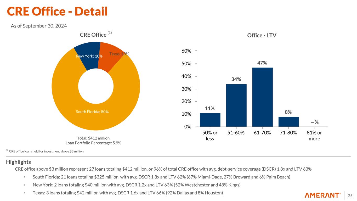 24 18% 33% 35% 14% —% 50% or less 50- 60% 60- 70% 70- 80% 80% or more 0% 10% 20% 30% 40% 50% 60% • Florida and Texas primarily include neighborhood shopping centers or service centers with basic needs related anchor stores, as well as the retail corridor in Miami Beach • New York primarily includes high traffic retail corridors with proximity to public transportation services • Single-tenant consist of two loans located in the Fulton Mall corridor in Brooklyn, NY, and five loans in South Florida (Food and Health, Clothing and Car Wash). Highlights CRE Retail (1) Retail - LTV Food and Health Retail; 10% Clothing; 27% Car Wash; 24%Groceries; 6% Restaurant; 8% Tobacco & CBD; 25% CRE Retail - Single Tenant (1) (1) CRE retail loans held for investment above $3.0 million Total: $654 million Loan Portfolio Percentage: 9.4% Total: $50 million Loan Portfolio Percentage: 0.7% Neighborhood Center; 36% Single Tenant; 8% Strip/Convenience; 21% Community Center; 21% Theme/Festival Center; 11% Retail Storefront; 3% CRE Retail - Detail As of September 30, 2024