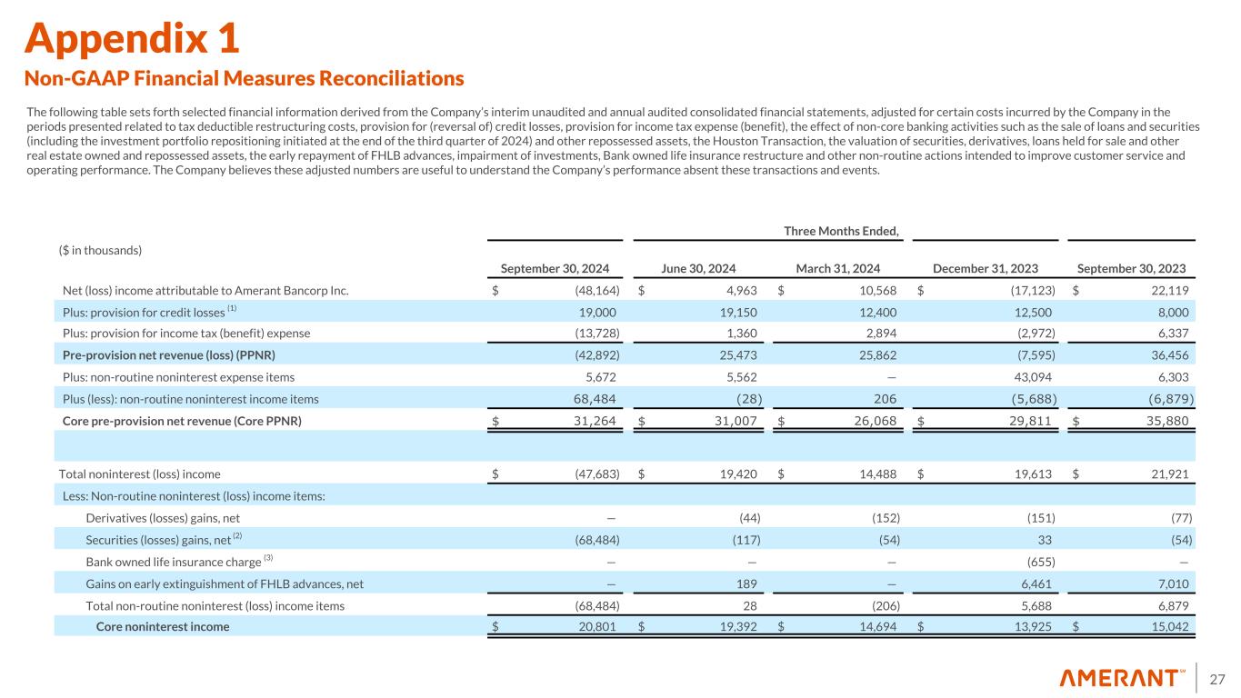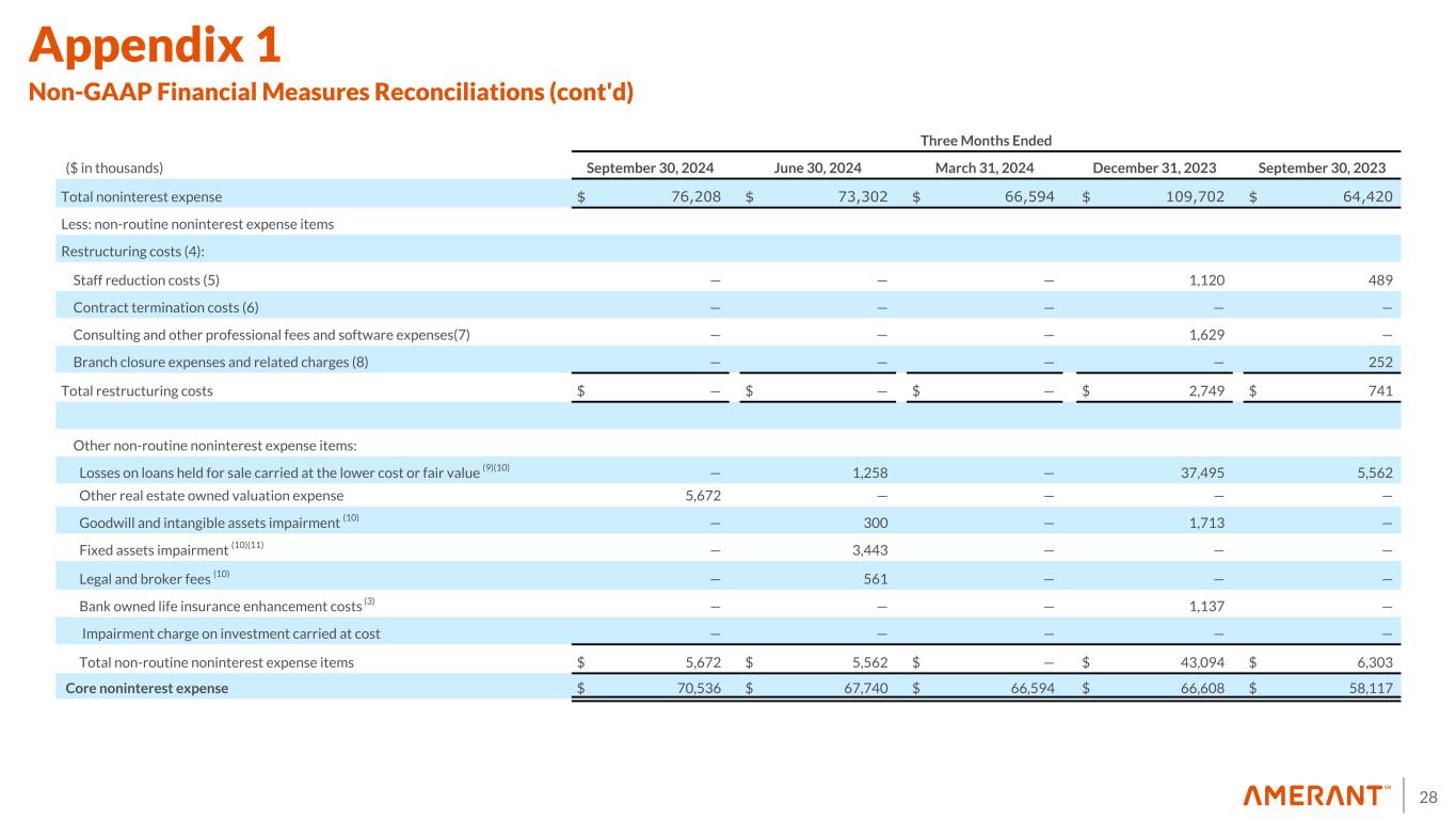 27 Appendix 1 Non-GAAP Financial Measures Reconciliations The following table sets forth selected financial information derived from the Company’s interim unaudited and annual audited consolidated financial statements, adjusted for certain costs incurred by the Company in the periods presented related to tax deductible restructuring costs, provision for (reversal of) credit losses, provision for income tax expense (benefit), the effect of non-core banking activities such as the sale of loans and securities (including the investment portfolio repositioning initiated at the end of the third quarter of 2024) and other repossessed assets, the Houston Transaction, the valuation of securities, derivatives, loans held for sale and other real estate owned and repossessed assets, the early repayment of FHLB advances, impairment of investments, Bank owned life insurance restructure and other non-routine actions intended to improve customer service and operating performance. The Company believes these adjusted numbers are useful to understand the Company’s performance absent these transactions and events. Three Months Ended, ($ in thousands) September 30, 2024 June 30, 2024 March 31, 2024 December 31, 2023 September 30, 2023 Net (loss) income attributable to Amerant Bancorp Inc. $ (48,164) $ 4,963 $ 10,568 $ (17,123) $ 22,119 Plus: provision for credit losses (1) 19,000 19,150 12,400 12,500 8,000 Plus: provision for income tax (benefit) expense (13,728) 1,360 2,894 (2,972) 6,337 Pre-provision net revenue (loss) (PPNR) (42,892) 25,473 25,862 (7,595) 36,456 Plus: non-routine noninterest expense items 5,672 5,562 — 43,094 6,303 Plus (less): non-routine noninterest income items 68,484 (28) 206 (5,688) (6,879) Core pre-provision net revenue (Core PPNR) $ 31,264 $ 31,007 $ 26,068 $ 29,811 $ 35,880 Total noninterest (loss) income $ (47,683) $ 19,420 $ 14,488 $ 19,613 $ 21,921 Less: Non-routine noninterest (loss) income items: Derivatives (losses) gains, net — (44) (152) (151) (77) Securities (losses) gains, net (2) (68,484) (117) (54) 33 (54) Bank owned life insurance charge (3) — — — (655) — Gains on early extinguishment of FHLB advances, net — 189 — 6,461 7,010 Total non-routine noninterest (loss) income items (68,484) 28 (206) 5,688 6,879 Core noninterest income $ 20,801 $ 19,392 $ 14,694 $ 13,925 $ 15,042