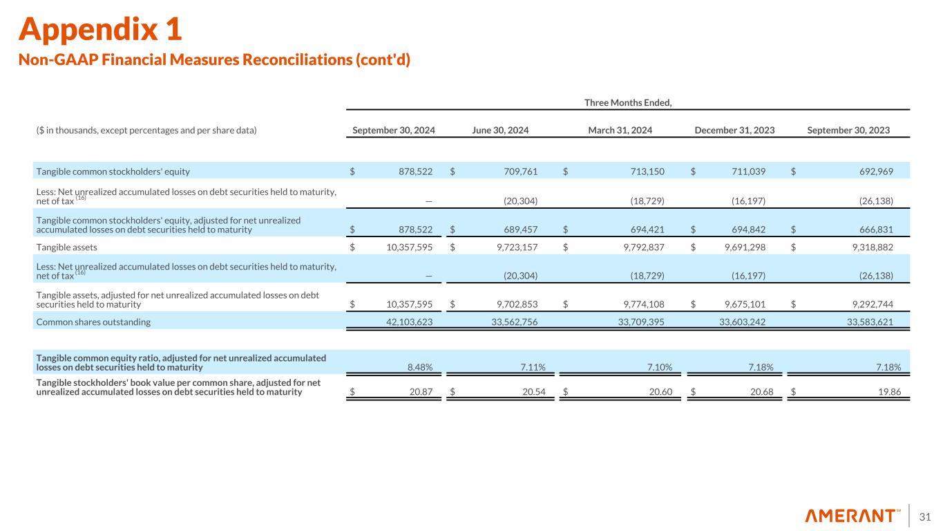 30 Three Months Ended, ($ in thousands, except percentages and per share data) September 30, 2024 June 30, 2024 March 31, 2024 December 31, 2023 September 30, 2023 Net (loss) income/ Average stockholders' equity (ROE) (24.98) % 2.68 % 5.69 % (9.22) % 11.93 % Plus: after tax impact of non-routine items in noninterest expense and BOLI tax impact (13) 2.25 % 2.36 % — % 19.96 % 2.60 % Plus (less): after tax impact of non-routine items in noninterest income 27.53 % (0.01) % 0.09 % (2.51) % (2.84) % Core net income / Average stockholders' equity (Core ROE) 4.80 % 5.03 % 5.78 % 8.23 % 11.69 % Efficiency ratio 228.74 % 74.21 % 72.03 % 108.30 % 64.10 % Less: impact of non-routine items in noninterest expense and and noninterest income (159.45) % (5.61) % (0.16) % (38.63) % (2.02) % Core efficiency ratio 69.29 % 68.60 % 71.87 % 69.67 % 62.08 % Stockholders' equity $ 902,888 $ 734,342 $ 738,085 $ 736,068 $ 719,787 Less: goodwill and other intangibles (15) (24,366) (24,581) (24,935) (25,029) (26,818) Tangible common stockholders' equity $ 878,522 $ 709,761 $ 713,150 $ 711,039 $ 692,969 Total assets 10,381,961 9,747,738 9,817,772 9,716,327 9,345,700 Less: goodwill and other intangibles (15) (24,366) (24,581) (24,935) (25,029) (26,818) Tangible assets $ 10,357,595 $ 9,723,157 $ 9,792,837 $ 9,691,298 $ 9,318,882 Common shares outstanding 42,103,623 33,562,756 33,709,395 33,603,242 33,583,621 Tangible common equity ratio 8.48 % 7.30 % 7.28 % 7.34 % 7.44 % Stockholders' book value per common share $ 21.44 $ 21.88 $ 21.90 $ 21.90 $ 21.43 Tangible stockholders' equity book value per common share $ 20.87 $ 21.15 $ 21.16 $ 21.16 $ 20.63 Appendix 1 Non-GAAP Financial Measures Reconciliations (cont'd)