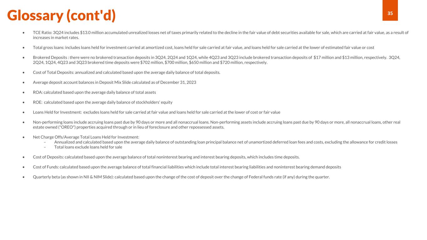 35Glossary (cont'd) • TCE Ratio: 3Q24 includes $13.0 million accumulated unrealized losses net of taxes primarily related to the decline in the fair value of debt securities available for sale, which are carried at fair value, as a result of increases in market rates. • Total gross loans: includes loans held for investment carried at amortized cost, loans held for sale carried at fair value, and loans held for sale carried at the lower of estimated fair value or cost • Brokered Deposits : there were no brokered transaction deposits in 3Q24, 2Q24 and 1Q24, while 4Q23 and 3Q23 include brokered transaction deposits of $17 million and $13 million, respectively. 3Q24, 2Q24, 1Q24, 4Q23 and 3Q23 brokered time deposits were $702 million, $700 million, $650 million and $720 million, respectively. • Cost of Total Deposits: annualized and calculated based upon the average daily balance of total deposits. • Average deposit account balances in Deposit Mix Slide calculated as of December 31, 2023 • ROA: calculated based upon the average daily balance of total assets • ROE: calculated based upon the average daily balance of stockholders' equity • Loans Held for Investment: excludes loans held for sale carried at fair value and loans held for sale carried at the lower of cost or fair value • Non-performing loans include accruing loans past due by 90 days or more and all nonaccrual loans. Non-performing assets include accruing loans past due by 90 days or more, all nonaccrual loans, other real estate owned ("OREO") properties acquired through or in lieu of foreclosure and other repossessed assets. • Net Charge Offs/Average Total Loans Held for Investment: – Annualized and calculated based upon the average daily balance of outstanding loan principal balance net of unamortized deferred loan fees and costs, excluding the allowance for credit losses – Total loans exclude loans held for sale • Cost of Deposits: calculated based upon the average balance of total noninterest bearing and interest bearing deposits, which includes time deposits. • Cost of Funds: calculated based upon the average balance of total financial liabilities which include total interest bearing liabilities and noninterest bearing demand deposits • Quarterly beta (as shown in NII & NIM Slide): calculated based upon the change of the cost of deposit over the change of Federal funds rate (if any) during the quarter.