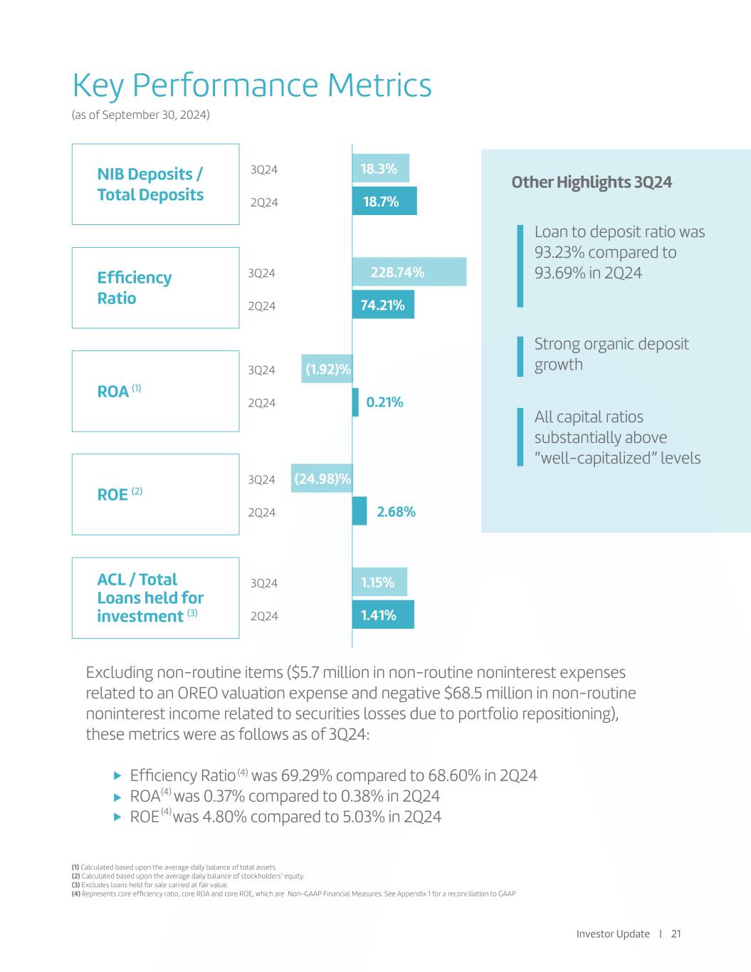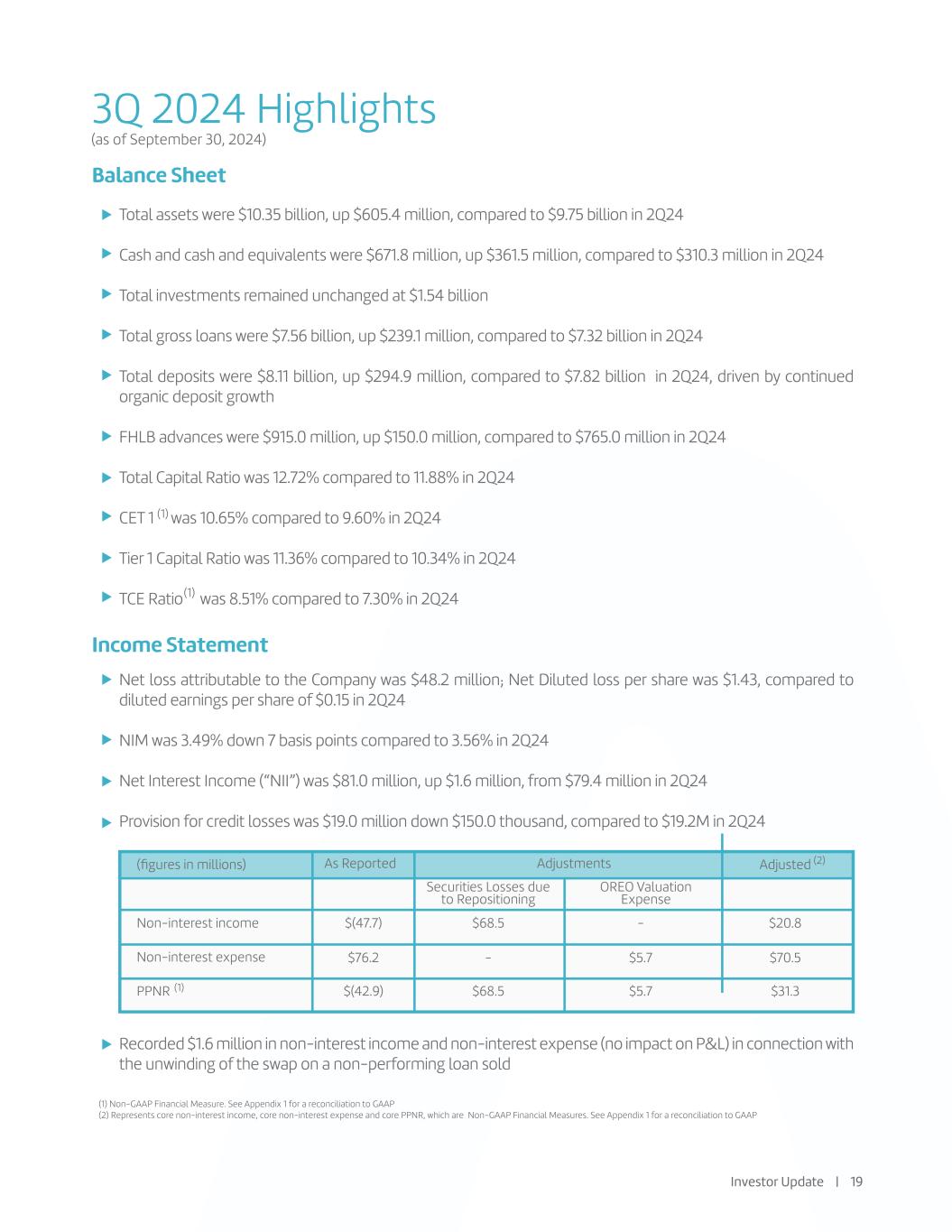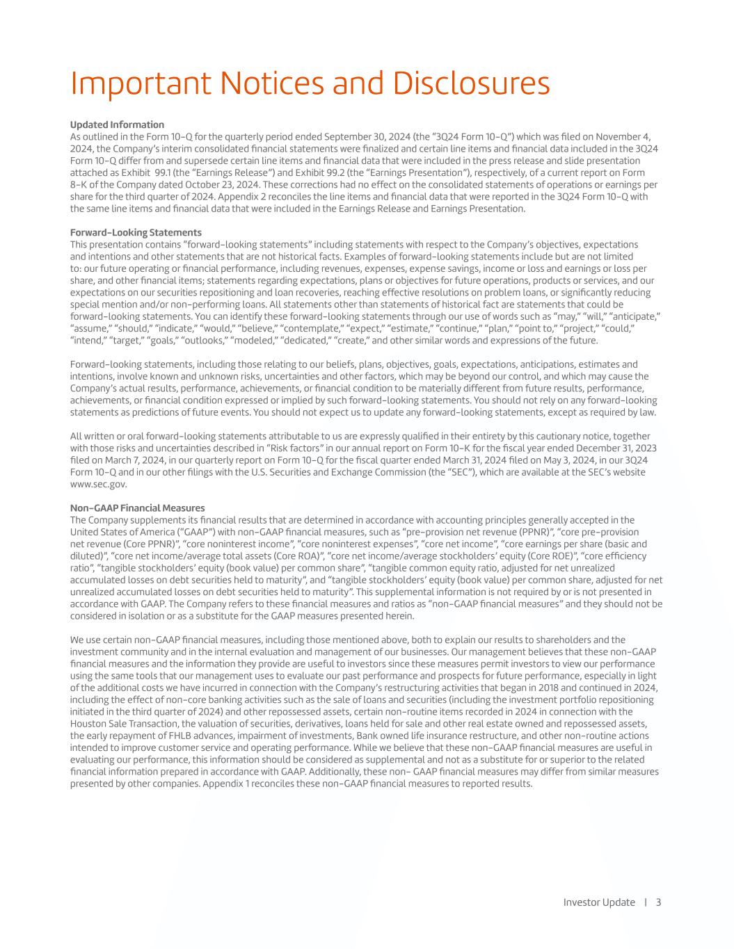 Important Notices and Disclosures Updated Information As outlined in the Form 10-Q for the quarterly period ended September 30, 2024 (the “3Q24 Form 10-Q”) which was filed on November 4, 2024, the Company’s interim consolidated financial statements were finalized and certain line items and financial data included in the 3Q24 Form 10-Q differ from and supersede certain line items and financial data that were included in the press release and slide presentation attached as Exhibit 99.1 (the “Earnings Release”) and Exhibit 99.2 (the “Earnings Presentation”), respectively, of a current report on Form 8-K of the Company dated October 23, 2024. These corrections had no effect on the consolidated statements of operations or earnings per share for the third quarter of 2024. Appendix 2 reconciles the line items and financial data that were reported in the 3Q24 Form 10-Q with the same line items and financial data that were included in the Earnings Release and Earnings Presentation. Forward-Looking Statements This presentation contains “forward-looking statements” including statements with respect to the Company’s objectives, expectations and intentions and other statements that are not historical facts. Examples of forward-looking statements include but are not limited to: our future operating or financial performance, including revenues, expenses, expense savings, income or loss and earnings or loss per share, and other financial items; statements regarding expectations, plans or objectives for future operations, products or services, and our expectations on our securities repositioning and loan recoveries, reaching effective resolutions on problem loans, or significantly reducing special mention and/or non-performing loans. All statements other than statements of historical fact are statements that could be forward-looking statements. You can identify these forward-looking statements through our use of words such as “may,” “will,” “anticipate,” “assume,” “should,” “indicate,” “would,” “believe,” “contemplate,” “expect,” “estimate,” “continue,” “plan,” “point to,” “project,” “could,” “intend,” “target,” “goals,” “outlooks,” “modeled,” “dedicated,” “create,” and other similar words and expressions of the future. Forward-looking statements, including those relating to our beliefs, plans, objectives, goals, expectations, anticipations, estimates and intentions, involve known and unknown risks, uncertainties and other factors, which may be beyond our control, and which may cause the Company’s actual results, performance, achievements, or financial condition to be materially different from future results, performance, achievements, or financial condition expressed or implied by such forward-looking statements. You should not rely on any forward-looking statements as predictions of future events. You should not expect us to update any forward-looking statements, except as required by law. All written or oral forward-looking statements attributable to us are expressly qualified in their entirety by this cautionary notice, together with those risks and uncertainties described in “Risk factors” in our annual report on Form 10-K for the fiscal year ended December 31, 2023 filed on March 7, 2024, in our quarterly report on Form 10-Q for the fiscal quarter ended March 31, 2024 filed on May 3, 2024, in our 3Q24 Form 10-Q and in our other filings with the U.S. Securities and Exchange Commission (the “SEC”), which are available at the SEC’s website www.sec.gov. Non-GAAP Financial Measures The Company supplements its financial results that are determined in accordance with accounting principles generally accepted in the United States of America (“GAAP”) with non-GAAP financial measures, such as “pre-provision net revenue (PPNR)”, “core pre-provision net revenue (Core PPNR)”, “core noninterest income”, “core noninterest expenses”, “core net income”, “core earnings per share (basic and diluted)”, “core net income/average total assets (Core ROA)”, “core net income/average stockholders’ equity (Core ROE)”, “core efficiency ratio”, “tangible stockholders’ equity (book value) per common share”, “tangible common equity ratio, adjusted for net unrealized accumulated losses on debt securities held to maturity”, and “tangible stockholders’ equity (book value) per common share, adjusted for net unrealized accumulated losses on debt securities held to maturity”. This supplemental information is not required by or is not presented in accordance with GAAP. The Company refers to these financial measures and ratios as “non-GAAP financial measures” and they should not be considered in isolation or as a substitute for the GAAP measures presented herein. We use certain non-GAAP financial measures, including those mentioned above, both to explain our results to shareholders and the investment community and in the internal evaluation and management of our businesses. Our management believes that these non-GAAP financial measures and the information they provide are useful to investors since these measures permit investors to view our performance using the same tools that our management uses to evaluate our past performance and prospects for future performance, especially in light of the additional costs we have incurred in connection with the Company’s restructuring activities that began in 2018 and continued in 2024, including the effect of non-core banking activities such as the sale of loans and securities (including the investment portfolio repositioning initiated in the third quarter of 2024) and other repossessed assets, certain non-routine items recorded in 2024 in connection with the Houston Sale Transaction, the valuation of securities, derivatives, loans held for sale and other real estate owned and repossessed assets, the early repaymen