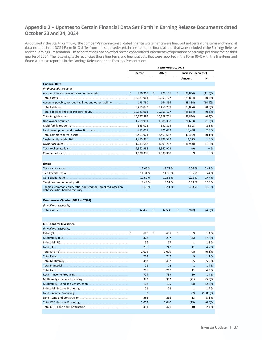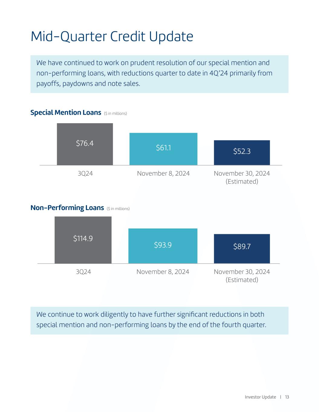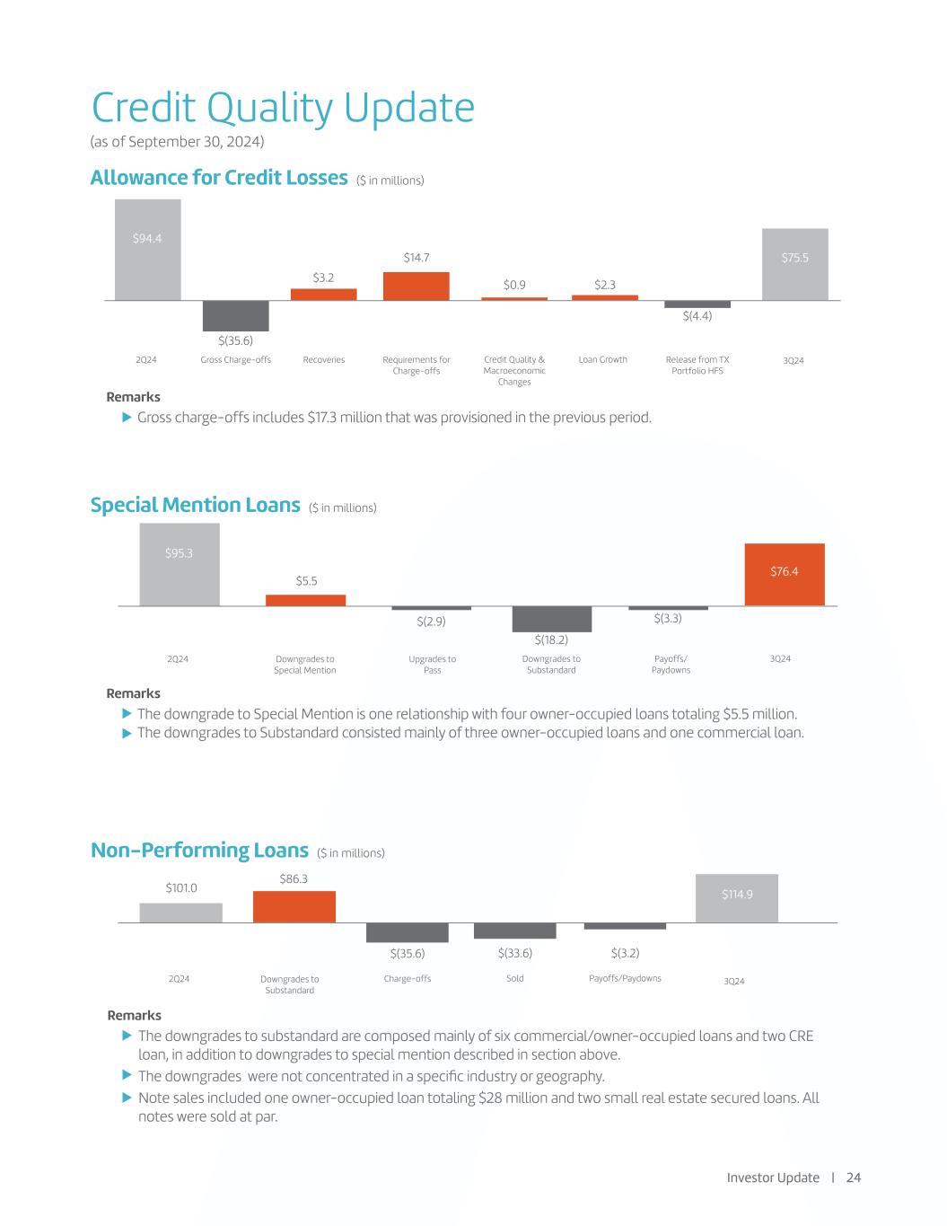 Important Notices and Disclosures Updated Information As outlined in the Form 10-Q for the quarterly period ended September 30, 2024 (the “3Q24 Form 10-Q”) which was filed on November 4, 2024, the Company’s interim consolidated financial statements were finalized and certain line items and financial data included in the 3Q24 Form 10-Q differ from and supersede certain line items and financial data that were included in the press release and slide presentation attached as Exhibit 99.1 (the “Earnings Release”) and Exhibit 99.2 (the “Earnings Presentation”), respectively, of a current report on Form 8-K of the Company dated October 23, 2024. These corrections had no effect on the consolidated statements of operations or earnings per share for the third quarter of 2024. Appendix 2 reconciles the line items and financial data that were reported in the 3Q24 Form 10-Q with the same line items and financial data that were included in the Earnings Release and Earnings Presentation. Forward-Looking Statements This presentation contains “forward-looking statements” including statements with respect to the Company’s objectives, expectations and intentions and other statements that are not historical facts. Examples of forward-looking statements include but are not limited to: our future operating or financial performance, including revenues, expenses, expense savings, income or loss and earnings or loss per share, and other financial items; statements regarding expectations, plans or objectives for future operations, products or services, and our expectations on our securities repositioning and loan recoveries, reaching effective resolutions on problem loans, or significantly reducing special mention and/or non-performing loans. All statements other than statements of historical fact are statements that could be forward-looking statements. You can identify these forward-looking statements through our use of words such as “may,” “will,” “anticipate,” “assume,” “should,” “indicate,” “would,” “believe,” “contemplate,” “expect,” “estimate,” “continue,” “plan,” “point to,” “project,” “could,” “intend,” “target,” “goals,” “outlooks,” “modeled,” “dedicated,” “create,” and other similar words and expressions of the future. Forward-looking statements, including those relating to our beliefs, plans, objectives, goals, expectations, anticipations, estimates and intentions, involve known and unknown risks, uncertainties and other factors, which may be beyond our control, and which may cause the Company’s actual results, performance, achievements, or financial condition to be materially different from future results, performance, achievements, or financial condition expressed or implied by such forward-looking statements. You should not rely on any forward-looking statements as predictions of future events. You should not expect us to update any forward-looking statements, except as required by law. All written or oral forward-looking statements attributable to us are expressly qualified in their entirety by this cautionary notice, together with those risks and uncertainties described in “Risk factors” in our annual report on Form 10-K for the fiscal year ended December 31, 2023 filed on March 7, 2024, in our quarterly report on Form 10-Q for the fiscal quarter ended March 31, 2024 filed on May 3, 2024, in our 3Q24 Form 10-Q and in our other filings with the U.S. Securities and Exchange Commission (the “SEC”), which are available at the SEC’s website www.sec.gov. Non-GAAP Financial Measures The Company supplements its financial results that are determined in accordance with accounting principles generally accepted in the United States of America (“GAAP”) with non-GAAP financial measures, such as “pre-provision net revenue (PPNR)”, “core pre-provision net revenue (Core PPNR)”, “core noninterest income”, “core noninterest expenses”, “core net income”, “core earnings per share (basic and diluted)”, “core net income/average total assets (Core ROA)”, “core net income/average stockholders’ equity (Core ROE)”, “core efficiency ratio”, “tangible stockholders’ equity (book value) per common share”, “tangible common equity ratio, adjusted for net unrealized accumulated losses on debt securities held to maturity”, and “tangible stockholders’ equity (book value) per common share, adjusted for net unrealized accumulated losses on debt securities held to maturity”. This supplemental information is not required by or is not presented in accordance with GAAP. The Company refers to these financial measures and ratios as “non-GAAP financial measures” and they should not be considered in isolation or as a substitute for the GAAP measures presented herein. We use certain non-GAAP financial measures, including those mentioned above, both to explain our results to shareholders and the investment community and in the internal evaluation and management of our businesses. Our management believes that these non-GAAP financial measures and the information they provide are useful to investors since these measures permit investors to view our performance using the same tools that our management uses to evaluate our past performance and prospects for future performance, especially in light of the additional costs we have incurred in connection with the Company’s restructuring activities that began in 2018 and continued in 2024, including the effect of non-core banking activities such as the sale of loans and securities (including the investment portfolio repositioning initiated in the third quarter of 2024) and other repossessed assets, certain non-routine items recorded in 2024 in connection with the Houston Sale Transaction, the valuation of securities, derivatives, loans held for sale and other real estate owned and repossessed assets, the early repaymen