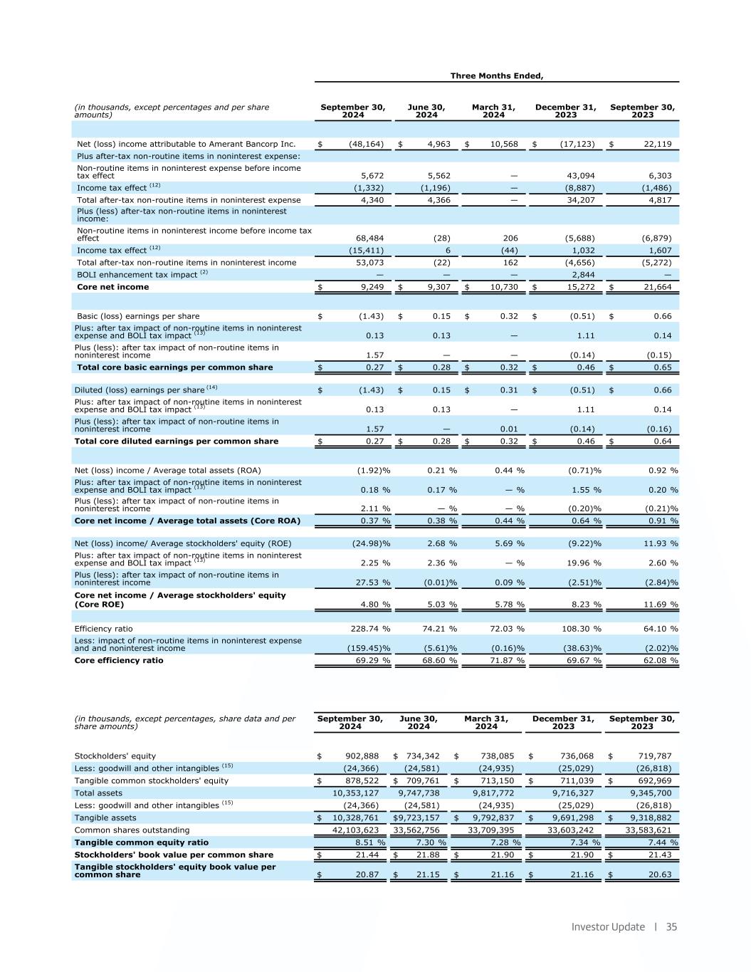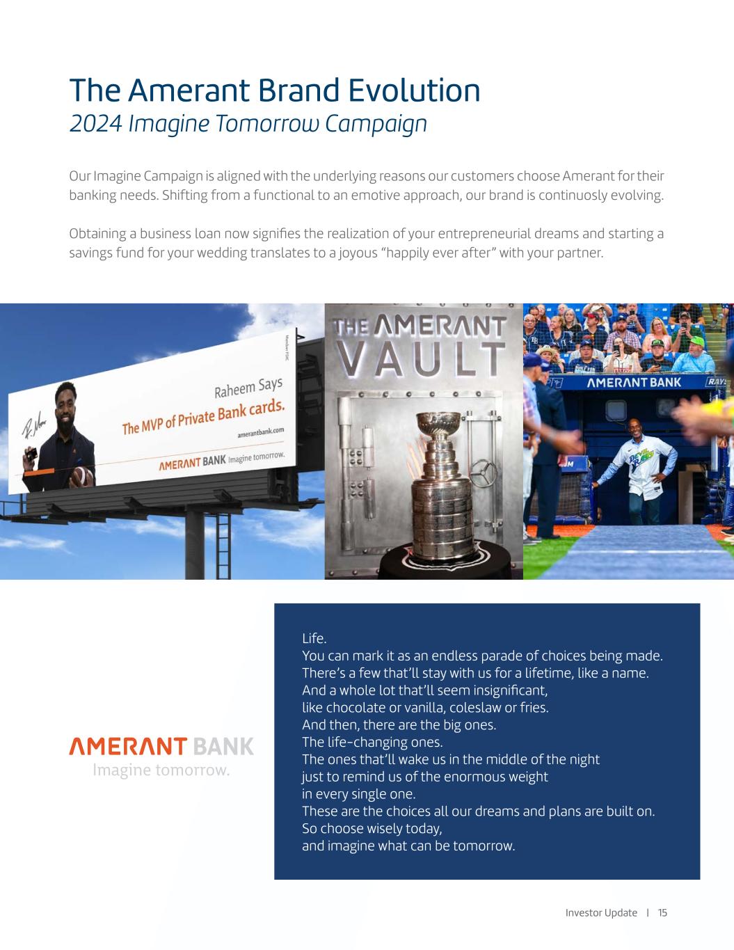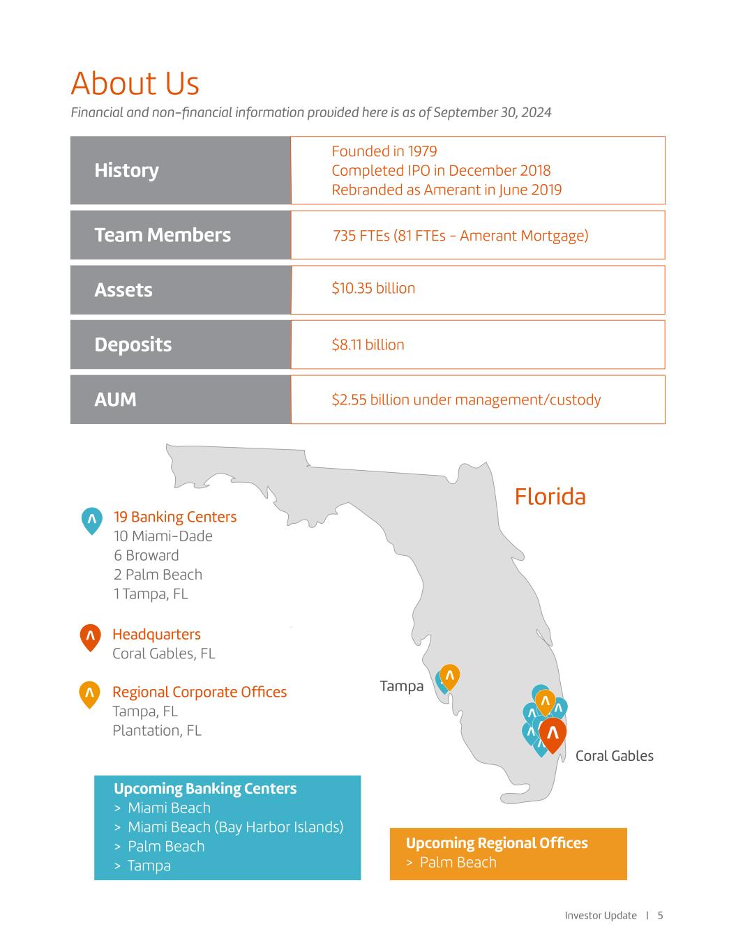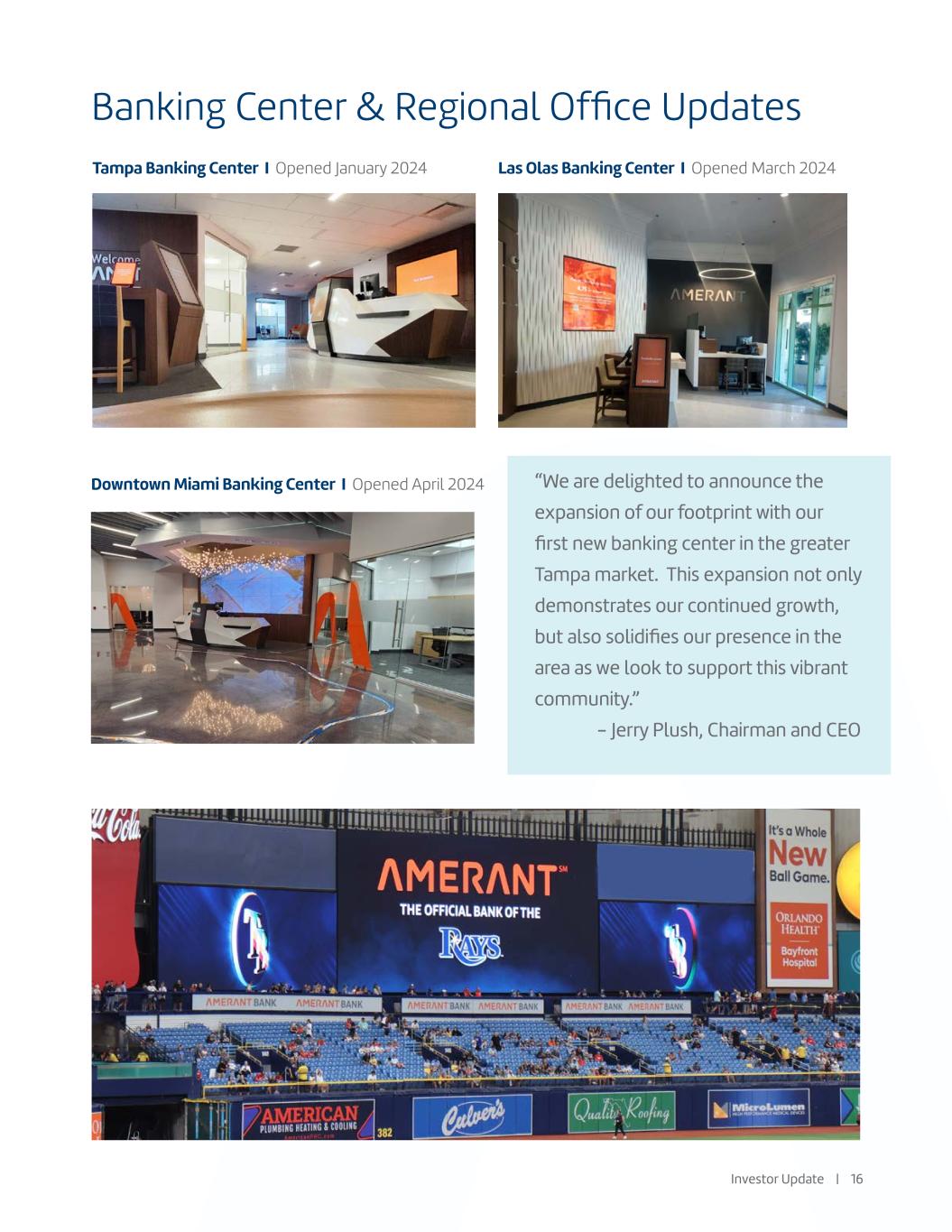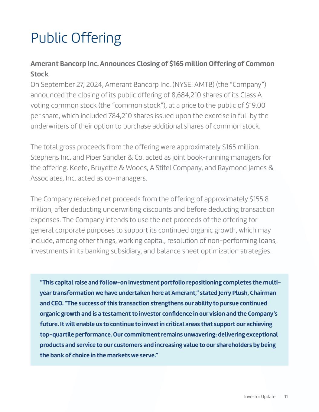 Public Offering Amerant Bancorp Inc. Announces Closing of $165 million Offering of Common Stock On September 27, 2024, Amerant Bancorp Inc. (NYSE: AMTB) (the “Company”) announced the closing of its public offering of 8,684,210 shares of its Class A voting common stock (the “common stock”), at a price to the public of $19.00 per share, which included 784,210 shares issued upon the exercise in full by the underwriters of their option to purchase additional shares of common stock. The total gross proceeds from the offering were approximately $165 million. Stephens Inc. and Piper Sandler & Co. acted as joint book-running managers for the offering. Keefe, Bruyette & Woods, A Stifel Company, and Raymond James & Associates, Inc. acted as co-managers. The Company received net proceeds from the offering of approximately $155.8 million, after deducting underwriting discounts and before deducting transaction expenses. The Company intends to use the net proceeds of the offering for general corporate purposes to support its continued organic growth, which may include, among other things, working capital, resolution of non-performing loans, investments in its banking subsidiary, and balance sheet optimization strategies. “This capital raise and follow-on investment portfolio repositioning completes the multi- year transformation we have undertaken here at Amerant,” stated Jerry Plush, Chairman and CEO. “The success of this transaction strengthens our ability to pursue continued organic growth and is a testament to investor confidence in our vision and the Company’s future. It will enable us to continue to invest in critical areas that support our achieving top-quartile performance. Our commitment remains unwavering: delivering exceptional products and service to our customers and increasing value to our shareholders by being the bank of choice in the markets we serve.” Investor Update | 11