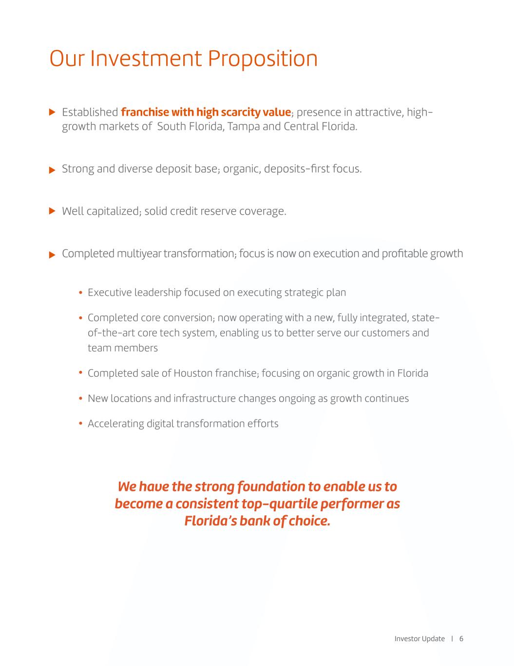 Our Investment Proposition Established franchise with high scarcity value; presence in attractive, high- growth markets of South Florida, Tampa and Central Florida. Strong and diverse deposit base; organic, deposits-first focus. Well capitalized; solid credit reserve coverage. Completed multiyear transformation; focus is now on execution and profitable growth Investor Update | 6 Executive leadership focused on executing strategic plan Completed core conversion; now operating with a new, fully integrated, state- of-the-art core tech system, enabling us to better serve our customers and team members Completed sale of Houston franchise; focusing on organic growth in Florida New locations and infrastructure changes ongoing as growth continues Accelerating digital transformation efforts We have the strong foundation to enable us to become a consistent top-quartile performer as Florida’s bank of choice.