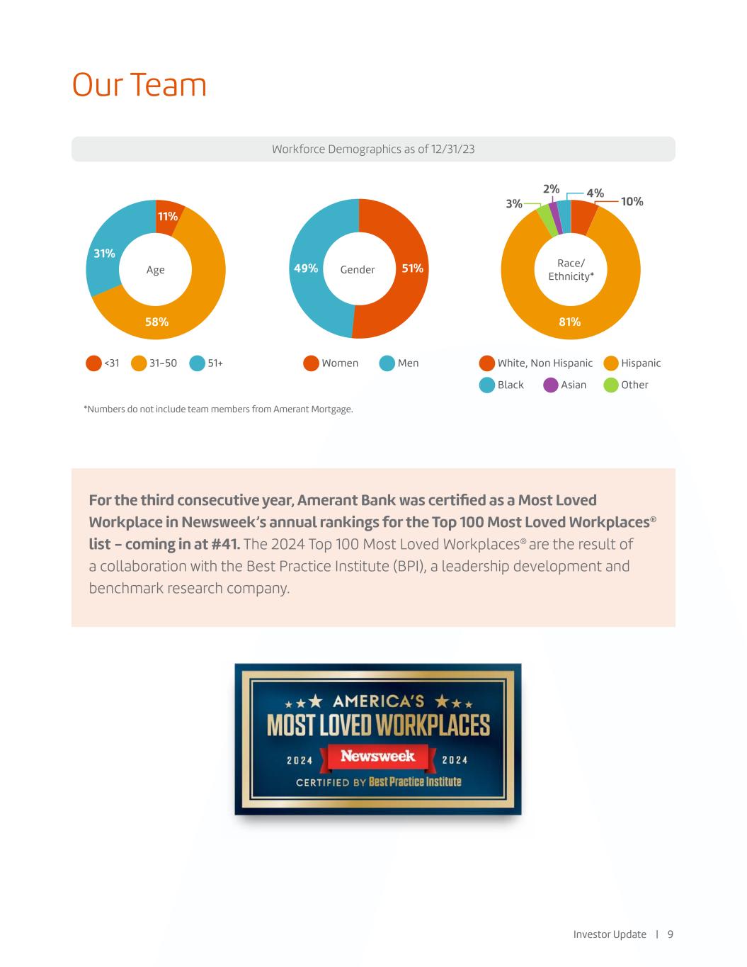 Our Team Workforce Demographics as of 12/31/23 For the third consecutive year, Amerant Bank was certified as a Most Loved Workplace in Newsweek’s annual rankings for the Top 100 Most Loved Workplaces® list - coming in at #41. The 2024 Top 100 Most Loved Workplaces® are the result of a collaboration with the Best Practice Institute (BPI), a leadership development and benchmark research company. *Numbers do not include team members from Amerant Mortgage. White, Non Hispanic Hispanic Black OtherAsian Women Men<31 31-50 51+ 49% 81% 10% 4% 3% 2% 51% 58% 11% 31% Age Gender Race/ Ethnicity* Investor Update | 9