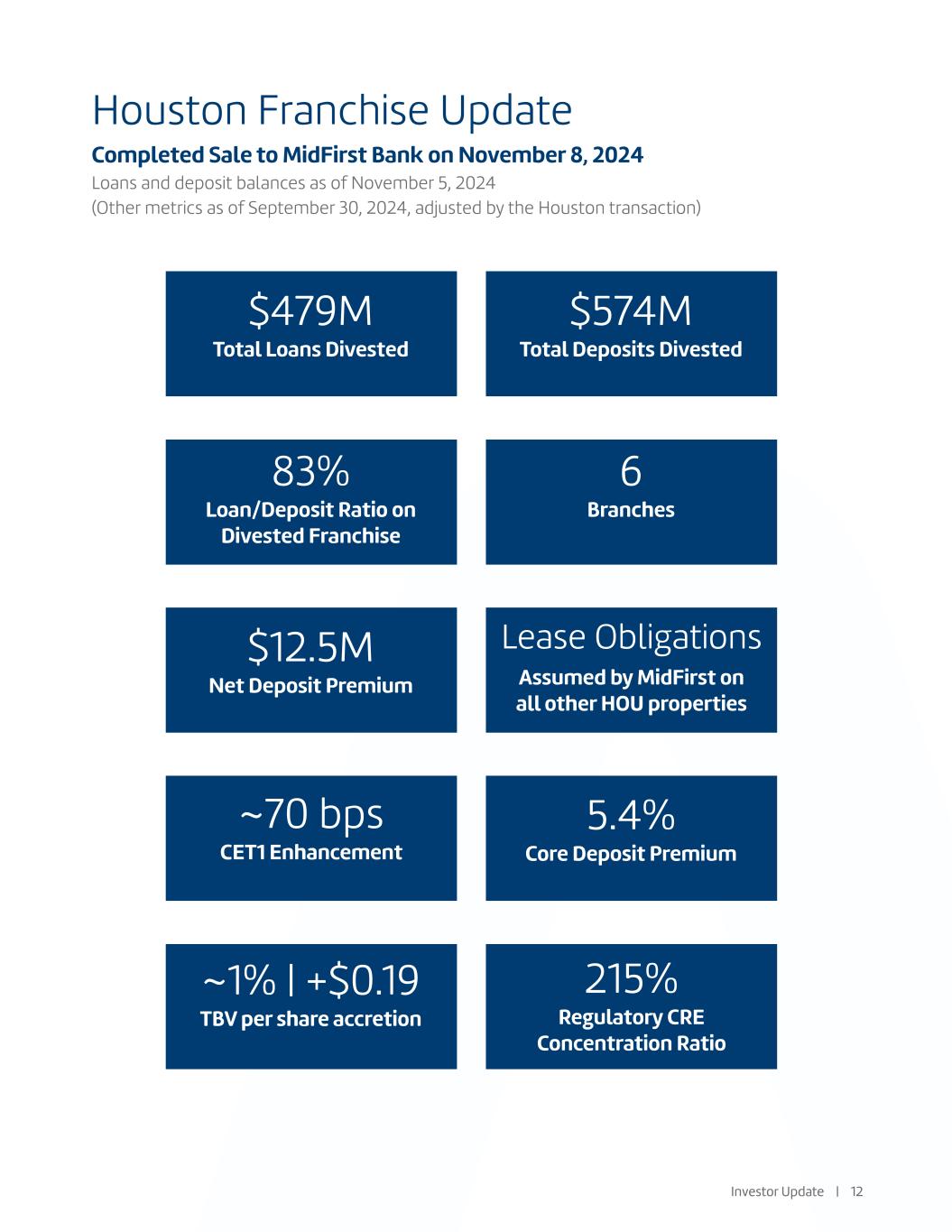 Houston Franchise Update Completed Sale to MidFirst Bank on November 8, 2024 $479M Total Loans Divested $574M Total Deposits Divested 83% Loan/Deposit Ratio on Divested Franchise 6 Branches $12.5M Net Deposit Premium 5.4% Core Deposit Premium ~70 bps CET1 Enhancement 215% Regulatory CRE Concentration Ratio ~1% | +$0.19 TBV per share accretion Investor Update | 12 Lease Obligations Assumed by MidFirst on all other HOU properties Loans and deposit balances as of November 5, 2024 (Other metrics as of September 30, 2024, adjusted by the Houston transaction)