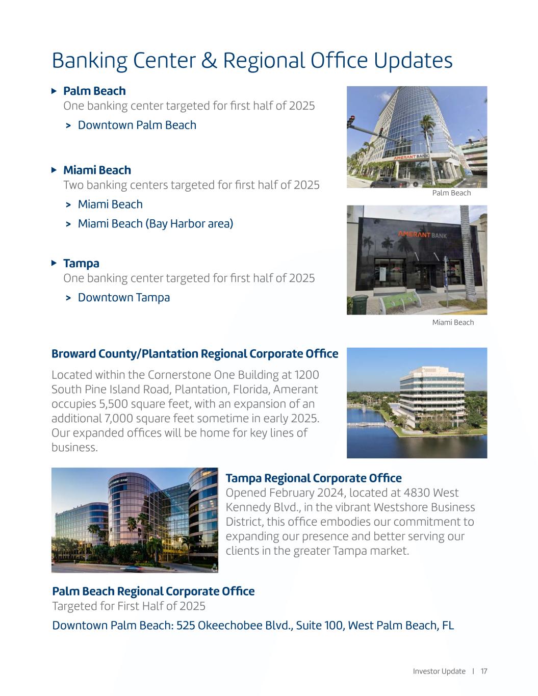 Banking Center & Regional Office Updates Broward County/Plantation Regional Corporate Office Located within the Cornerstone One Building at 1200 South Pine Island Road, Plantation, Florida, Amerant occupies 5,500 square feet, with an expansion of an additional 7,000 square feet sometime in early 2025. Our expanded offices will be home for key lines of business. Tampa Regional Corporate Office Opened February 2024, located at 4830 West Kennedy Blvd., in the vibrant Westshore Business District, this office embodies our commitment to expanding our presence and better serving our clients in the greater Tampa market. Investor Update | 17 Palm Beach One banking center targeted for first half of 2025 > Downtown Palm Beach Miami Beach Two banking centers targeted for first half of 2025 > Miami Beach > Miami Beach (Bay Harbor area) Tampa One banking center targeted for first half of 2025 > Downtown Tampa Palm Beach Regional Corporate Office Targeted for First Half of 2025 Downtown Palm Beach: 525 Okeechobee Blvd., Suite 100, West Palm Beach, FL Palm Beach Miami Beach