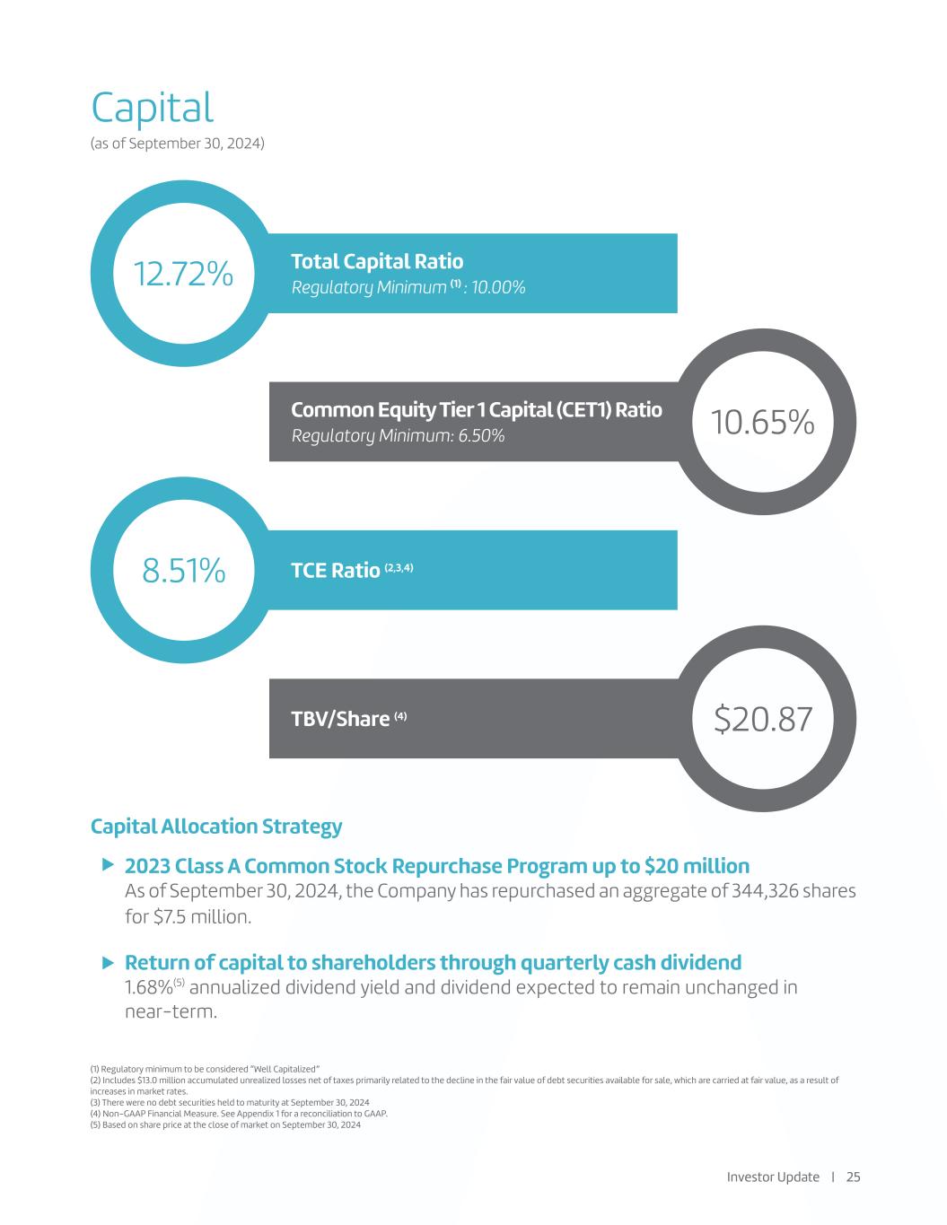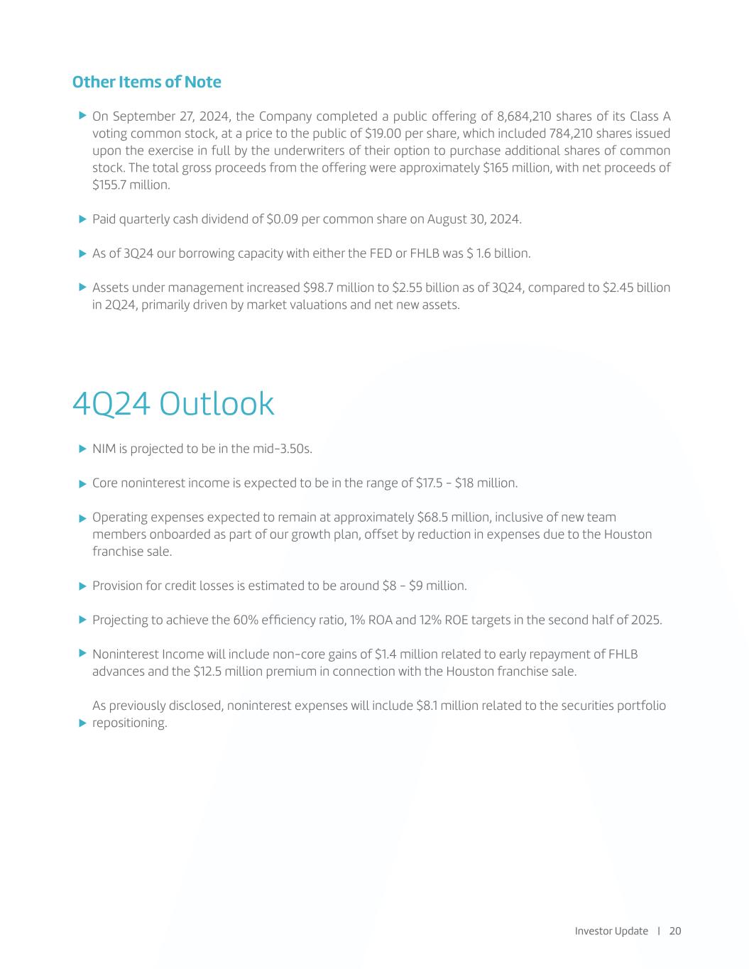 4Q24 Outlook NIM is projected to be in the mid-3.50s. Core noninterest income is expected to be in the range of $17.5 - $18 million. Operating expenses expected to remain at approximately $68.5 million, inclusive of new team members onboarded as part of our growth plan, offset by reduction in expenses due to the Houston franchise sale. Provision for credit losses is estimated to be around $8 - $9 million. Projecting to achieve the 60% efficiency ratio, 1% ROA and 12% ROE targets in the second half of 2025. Noninterest Income will include non-core gains of $1.4 million related to early repayment of FHLB advances and the $12.5 million premium in connection with the Houston franchise sale. As previously disclosed, noninterest expenses will include $8.1 million related to the securities portfolio repositioning. Other Items of Note On September 27, 2024, the Company completed a public offering of 8,684,210 shares of its Class A voting common stock, at a price to the public of $19.00 per share, which included 784,210 shares issued upon the exercise in full by the underwriters of their option to purchase additional shares of common stock. The total gross proceeds from the offering were approximately $165 million, with net proceeds of $155.7 million. Paid quarterly cash dividend of $0.09 per common share on August 30, 2024. As of 3Q24 our borrowing capacity with either the FED or FHLB was $ 1.6 billion. Assets under management increased $98.7 million to $2.55 billion as of 3Q24, compared to $2.45 billion in 2Q24, primarily driven by market valuations and net new assets. Investor Update | 20