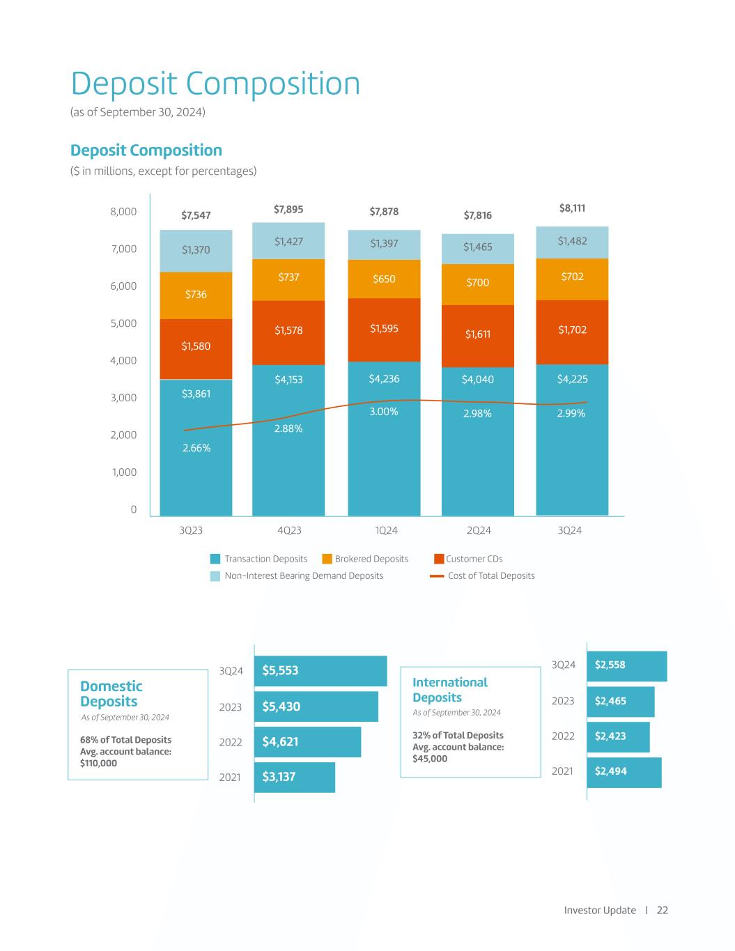 Deposit Composition Deposit Composition ($ in millions, except for percentages) Transaction Deposits Brokered Deposits Customer CDs Non-Interest Bearing Demand Deposits Cost of Total Deposits International Deposits 32% of Total Deposits Avg. account balance: $45,000 2023 $2,4652023 $5,430 2022 $2,4232022 $4,621 2021 $2,4942021 $3,137 3Q23 4Q23 1Q24 2Q24 3Q24 $1,482 $8,1118,000 7,000 6,000 5,000 4,000 3,000 2,000 1,000 0 3Q24 $2,5583Q24 $5,553 Domestic Deposits 68% of Total Deposits Avg. account balance: $110,000 2.99% $702 $1,702 $4,225 $1,370 $7,547 2.66% $736 $1,580 $3,861 Investor Update | 22 $1,427 $7,895 2.88% $737 $1,578 $4,153 As of September 30, 2024 As of September 30, 2024 $1,397 $1,465 $7,878 $7,816 3.00% 2.98% $650 $1,595 $4,236 $700 $1,611 $4,040 (as of September 30, 2024)