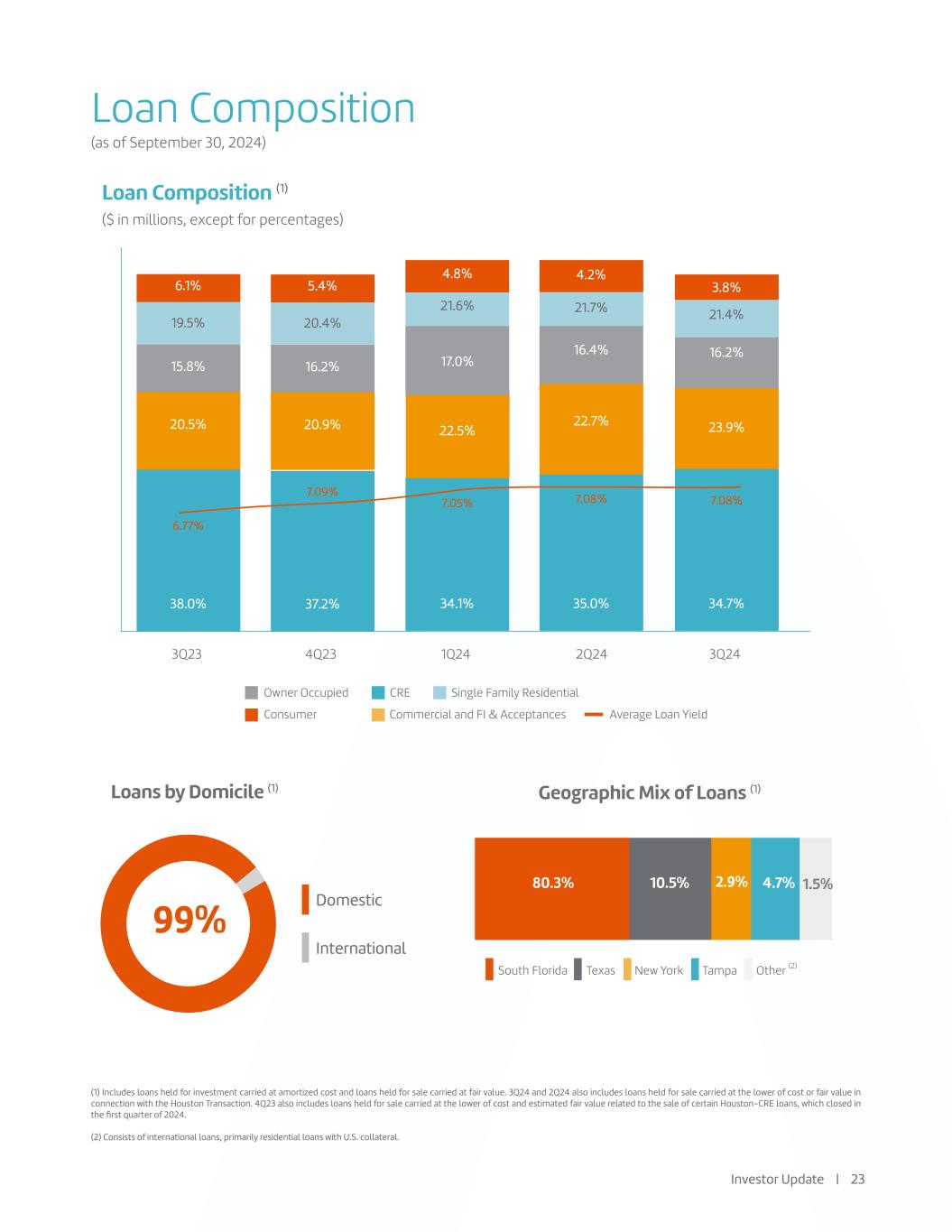 Loan Composition Loan Composition (1) ($ in millions, except for percentages) (1) Includes loans held for investment carried at amortized cost and loans held for sale carried at fair value. 3Q24 and 2Q24 also includes loans held for sale carried at the lower of cost or fair value in connection with the Houston Transaction. 4Q23 also includes loans held for sale carried at the lower of cost and estimated fair value related to the sale of certain Houston-CRE loans, which closed in the first quarter of 2024. (2) Consists of international loans, primarily residential loans with U.S. collateral. South Florida Texas New York Tampa Other (2) Owner Occupied CRE Single Family Residential Consumer Commercial and FI & Acceptances Average Loan Yield Loans by Domicile (1) Geographic Mix of Loans (1) 3Q23 4Q23 1Q24 2Q24 3Q24 Domestic International 99% 80.3% 10.5% 2.9% 4.7% 34.7% 7.08% 3.8% 21.4% 16.2% 23.9% 6.1% 19.5% 15.8% 20.5% 38.0% 6.77% 1.5% Investor Update | 23 5.4% 20.4% 16.2% 20.9% 37.2% 7.09% 34.1% 35.0% 4.8% 21.6% 17.0% 22.5% 7.05% 7.08% 4.2% 21.7% 16.4% 22.7% (as of September 30, 2024)