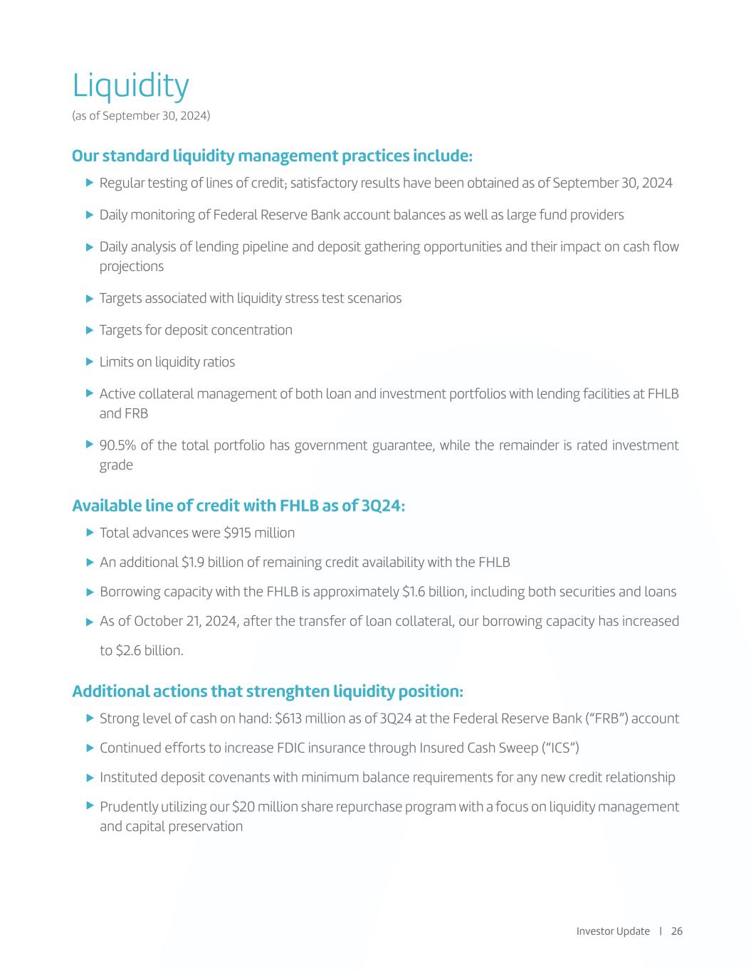 Liquidity Regular testing of lines of credit; satisfactory results have been obtained as of September 30, 2024 Daily monitoring of Federal Reserve Bank account balances as well as large fund providers Daily analysis of lending pipeline and deposit gathering opportunities and their impact on cash flow projections Targets associated with liquidity stress test scenarios Targets for deposit concentration Limits on liquidity ratios Active collateral management of both loan and investment portfolios with lending facilities at FHLB and FRB 90.5% of the total portfolio has government guarantee, while the remainder is rated investment grade Total advances were $915 million An additional $1.9 billion of remaining credit availability with the FHLB Borrowing capacity with the FHLB is approximately $1.6 billion, including both securities and loans As of October 21, 2024, after the transfer of loan collateral, our borrowing capacity has increased to $2.6 billion. Strong level of cash on hand: $613 million as of 3Q24 at the Federal Reserve Bank (“FRB”) account Continued efforts to increase FDIC insurance through Insured Cash Sweep (“ICS”) Instituted deposit covenants with minimum balance requirements for any new credit relationship Prudently utilizing our $20 million share repurchase program with a focus on liquidity management and capital preservation Our standard liquidity management practices include: Available line of credit with FHLB as of 3Q24: Additional actions that strenghten liquidity position: Investor Update | 26 (as of September 30, 2024)
