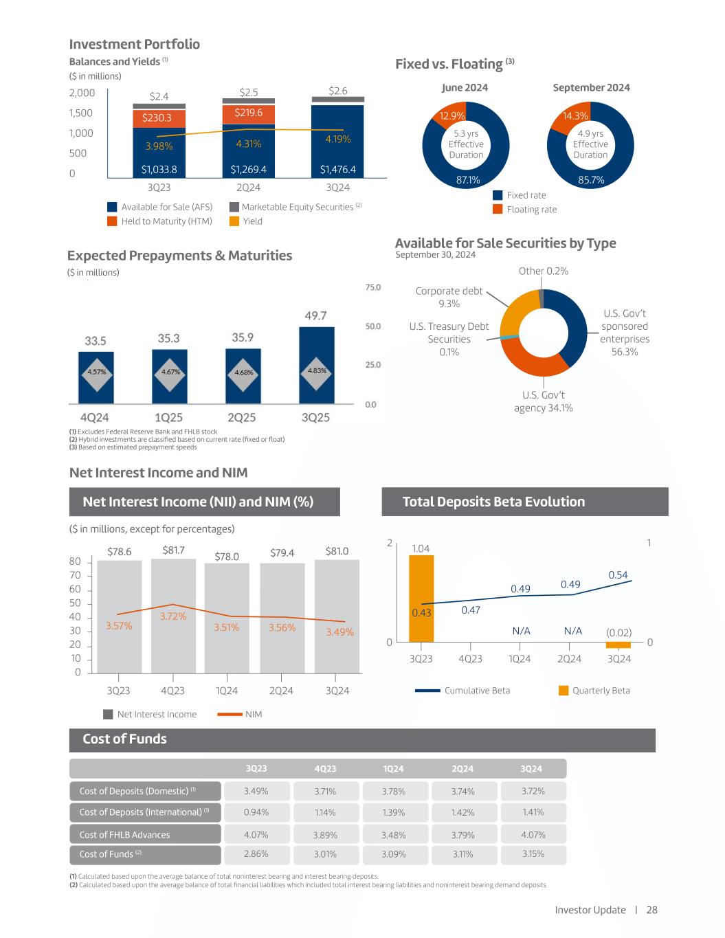 3.56% $79.4 Net Interest Income and NIM ($ in millions, except for percentages) Net Interest Income (NII) and NIM (%) Total Deposits Beta Evolution Cost of Funds (1) Calculated based upon the average balance of total noninterest bearing and interest bearing deposits. (2) Calculated based upon the average balance of total financial liabilities which included total interest bearing liabilities and noninterest bearing demand deposits Cumulative Beta Quarterly Beta Net Interest Income NIM 2 0 80 70 60 50 40 30 20 10 0 1 0 3Q23 3Q24 $78.0 3.51%3.57% 3.72% $78.6 $81.7 4Q23 3Q23 1Q24 4Q23 1.04 2Q24 1Q24 3Q24 2Q24 3.72% 1.41% 4.07% 3.15% 3.49% 0.94% 4.07% 2.86% Cost of Deposits (Domestic) (1) Cost of Deposits (International) (1) Cost of FHLB Advances Cost of Funds (2) 3Q243Q23 0.43 0.47 0.49 0.49 Investment Portfolio Balances and Yields (1) ($ in millions) Available for Sale (AFS) Marketable Equity Securities (2) Held to Maturity (HTM) Yield 2,000 1,500 1,000 500 0 $2.4 $2.6 3Q23 2Q24 3Q24 $230.3 $219.6 $1,033.8 $1,269.4 $1,476.4 3.98% 4.31% 4.19% $2.5 Fixed vs. Floating (3) June 2024 September 2024 5.3 yrs Effective Duration 4.9 yrs Effective Duration Fixed rate Floating rate 12.9% 87.1% 14.3% 85.7% Available for Sale Securities by Type September 30, 2024 Corporate debt 9.3% U.S. Treasury Debt Securities 0.1% U.S. Gov’t agency 34.1% U.S. Gov’t sponsored enterprises 56.3% Other 0.2% (1) Excludes Federal Reserve Bank and FHLB stock (2) Hybrid investments are classified based on current rate (fixed or float) (3) Based on estimated prepayment speeds Investor Update | 28 0.54 4Q23 3.71% 1.14% 3.89% 3.01% Expected Prepayments & Maturities ($ in millions) N/A N/A 3.78% 1.39% 3.48% 3.09% 3.74% 1.42% 3.79% 3.11% 1Q24 2Q24 3.49% $81.0 (0.02)