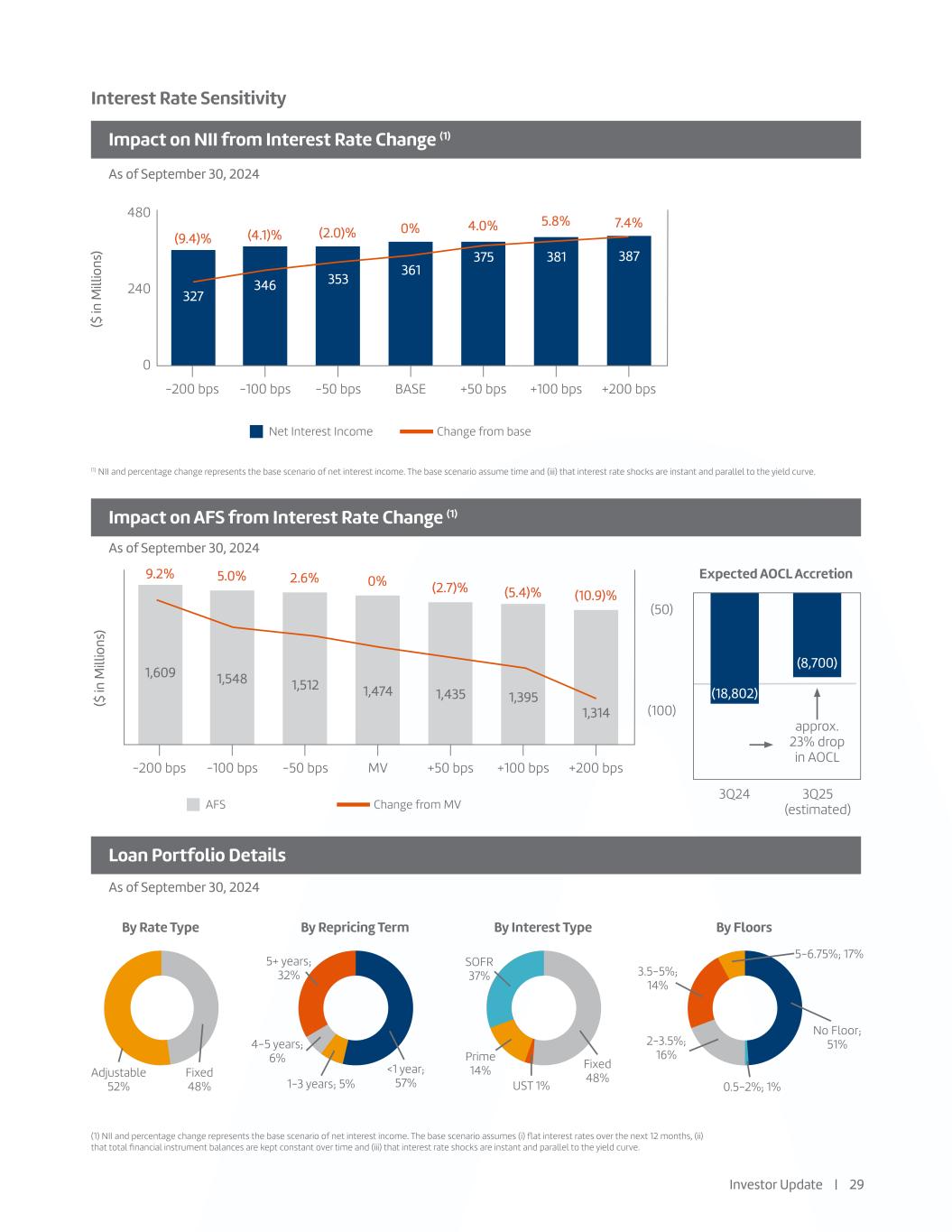 Interest Rate Sensitivity Impact on NII from Interest Rate Change (1) Impact on AFS from Interest Rate Change (1) Loan Portfolio Details As of September 30, 2024 As of September 30, 2024 ($ in M ill io ns ) ($ in M ill io ns ) Net Interest Income Change from base AFS Change from MV 480 240 0 (9.4)% 9.2% 327 1,609 346 1,548 353 1,512 361 1,474 375 (18,802) (8,700) 1,435 381 1,395 387 1,314 (4.1)% 5.0% (2.0)% 2.6% 0% 0% 4.0% (2.7)% 5.8% (5.4)% 7.4% (10.9)% -200 bps (50) 3Q24 3Q25 (estimated) approx. 23% drop in AOCL (100) -200 bps -100 bps -100 bps -50 bps -50 bps BASE MV +50 bps +50 bps +100 bps +100 bps +200 bps +200 bps (1) NII and percentage change represents the base scenario of net interest income. The base scenario assume time and (iii) that interest rate shocks are instant and parallel to the yield curve. (1) NII and percentage change represents the base scenario of net interest income. The base scenario assumes (i) flat interest rates over the next 12 months, (ii) that total financial instrument balances are kept constant over time and (iii) that interest rate shocks are instant and parallel to the yield curve. Expected AOCL Accretion By Rate Type By Repricing Term By Interest Type By Floors Adjustable 52% Fixed 48% 5+ years; 32% <1 year; 57% Fixed 48% UST 1% Prime 14% 4-5 years; 6% 1-3 years; 5% SOFR 37% 5-6.75%; 17% 3.5-5%; 14% 2-3.5%; 16% 0.5-2%; 1% No Floor; 51% Investor Update | 29 As of September 30, 2024