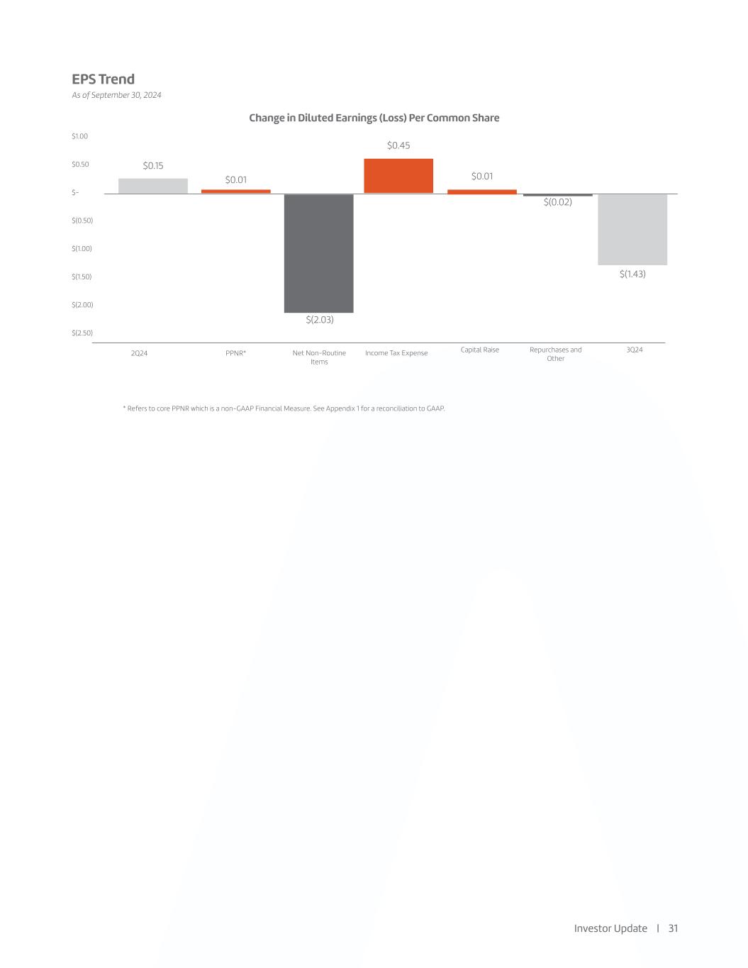 Investor Update | 31 $(2.03) Change in Diluted Earnings (Loss) Per Common Share EPS Trend Income Tax Expense Capital Raise2Q24 PPNR* Net Non-Routine Items 3Q24 $0.01 $1.00 $0.50 $- $(0.50) $(1.00) $(1.50) $(2.00) $(2.50) * Refers to core PPNR which is a non-GAAP Financial Measure. See Appendix 1 for a reconciliation to GAAP. $0.01 Repurchases and Other $0.45 $0.15 $(0.02) $(1.43) As of September 30, 2024