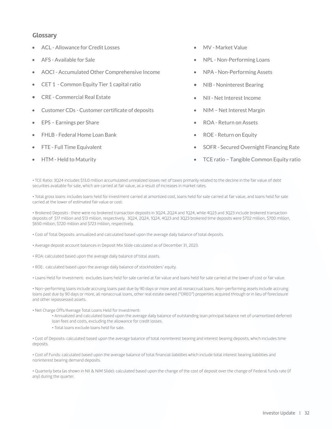 Glossary Investor Update | 32 • TCE Ratio: 3Q24 includes $13.0 million accumulated unrealized losses net of taxes primarily related to the decline in the fair value of debt securities available for sale, which are carried at fair value, as a result of increases in market rates. • Total gross loans: includes loans held for investment carried at amortized cost, loans held for sale carried at fair value, and loans held for sale carried at the lower of estimated fair value or cost. • Brokered Deposits : there were no brokered transaction deposits in 3Q24, 2Q24 and 1Q24, while 4Q23 and 3Q23 include brokered transaction deposits of $17 million and $13 million, respectively. 3Q24, 2Q24, 1Q24, 4Q23 and 3Q23 brokered time deposits were $702 million, $700 million, $650 million, $720 million and $723 million, respectively. • Cost of Total Deposits: annualized and calculated based upon the average daily balance of total deposits. • Average deposit account balances in Deposit Mix Slide calculated as of December 31, 2023. • ROA: calculated based upon the average daily balance of total assets. • ROE: calculated based upon the average daily balance of stockholders’ equity. • Loans Held for Investment: excludes loans held for sale carried at fair value and loans held for sale carried at the lower of cost or fair value. • Non-performing loans include accruing loans past due by 90 days or more and all nonaccrual loans. Non-performing assets include accruing loans past due by 90 days or more, all nonaccrual loans, other real estate owned (“OREO”) properties acquired through or in lieu of foreclosure and other repossessed assets. • Net Charge Offs/Average Total Loans Held for Investment: • Annualized and calculated based upon the average daily balance of outstanding loan principal balance net of unamortized deferred loan fees and costs, excluding the allowance for credit losses. • Total loans exclude loans held for sale. • Cost of Deposits: calculated based upon the average balance of total noninterest bearing and interest bearing deposits, which includes time deposits. • Cost of Funds: calculated based upon the average balance of total financial liabilities which include total interest bearing liabilities and noninterest bearing demand deposits. • Quarterly beta (as shown in NII & NIM Slide): calculated based upon the change of the cost of deposit over the change of Federal funds rate (if any) during the quarter.