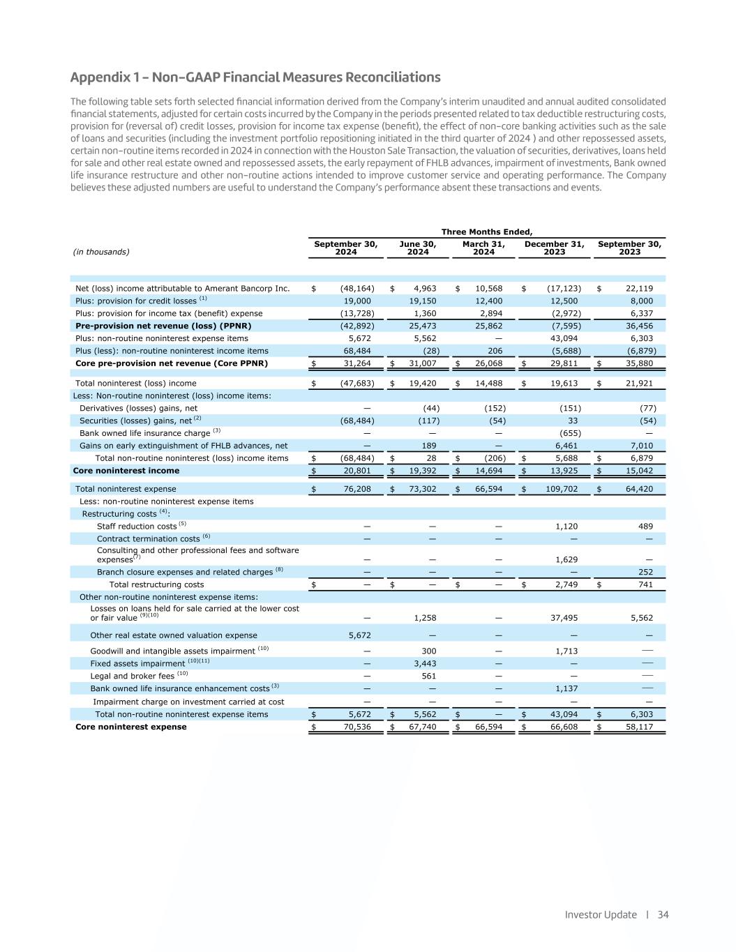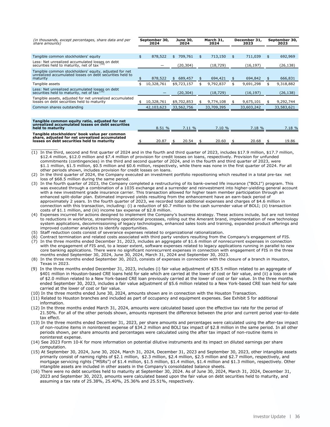 Appendix 1 - Non-GAAP Financial Measures Reconciliations The following table sets forth selected financial information derived from the Company’s interim unaudited and annual audited consolidated financial statements, adjusted for certain costs incurred by the Company in the periods presented related to tax deductible restructuring costs, provision for (reversal of) credit losses, provision for income tax expense (benefit), the effect of non-core banking activities such as the sale of loans and securities (including the investment portfolio repositioning initiated in the third quarter of 2024 ) and other repossessed assets, certain non-routine items recorded in 2024 in connection with the Houston Sale Transaction, the valuation of securities, derivatives, loans held for sale and other real estate owned and repossessed assets, the early repayment of FHLB advances, impairment of investments, Bank owned life insurance restructure and other non-routine actions intended to improve customer service and operating performance. The Company believes these adjusted numbers are useful to understand the Company’s performance absent these transactions and events. Investor Update | 34