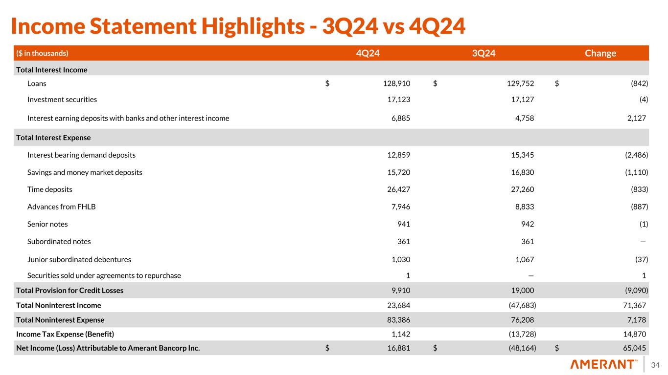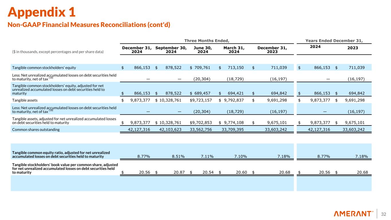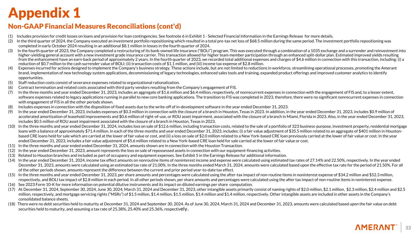 33 Appendix 1 Non-GAAP Financial Measures Reconciliations (cont'd) (1) Includes provision for credit losses on loans and provision for loan contingencies. See footnote 6 in Exhibit 1 - Selected Financial Information in the Earnings Release for more details. (2) In the third quarter of 2024, the Company executed an investment portfolio repositioning which resulted in a total pre-tax net loss of $68.5 million during the same period. The investment portfolio repositioning was completed in early October 2024 resulting in an additional $8.1 million in losses in the fourth quarter of 2024. (3) In the fourth quarter of 2023, the Company completed a restructuring of its bank-owned life insurance (“BOLI”) program. This was executed through a combination of a 1035 exchange and a surrender and reinvestment into higher-yielding general account with a new investment grade insurance carrier. This transaction allowed for higher team member participation through an enhanced split-dollar plan. Estimated improved yields resulting from the enhancement have an earn-back period of approximately 2 years. In the fourth quarter of 2023, we recorded total additional expenses and charges of $4.6 million in connection with this transaction, including: (i) a reduction of $0.7 million to the cash surrender value of BOLI; (ii) transaction costs of $1.1 million, and (iii) income tax expense of $2.8 million. (4) Expenses incurred for actions designed to implement the Company’s business strategy. These actions include, but are not limited to reductions in workforce, streamlining operational processes, promoting the Amerant brand, implementation of new technology system applications, decommissioning of legacy technologies, enhanced sales tools and training, expanded product offerings and improved customer analytics to identify opportunities. (5) Staff reduction costs consist of severance expenses related to organizational rationalization. (6) Contract termination and related costs associated with third party vendors resulting from the Company’s engagement of FIS. (7) In the three months and year ended December 31, 2023, includes an aggregate of $1.6 million and $6.4 million, respectively, of nonrecurrent expenses in connection with the engagement of FIS and, to a lesser extent, software expenses related to legacy applications running in parallel to new core banking applications. The transition to FIS was completed in 2023, therefore, there were no significant nonrecurrent expenses in connection with engagement of FIS in all the other periods shown. (8) Includes expenses in connection with the disposition of fixed assets due to the write-off of in-development software in the year ended December 31, 2023. (9) In the year ended December 31, 2023, includes expenses of $0.3 million in connection with the closure of a branch in Houston, Texas in 2023. In addition, in the year ended December 31, 2023, includes $0.9 million of accelerated amortization of leasehold improvements and $0.6 million of right-of-use, or ROU asset impairment, associated with the closure of a branch in Miami, Florida in 2023. Also, in the year ended December 31, 2023, includes $0.5 million of ROU asset impairment associated with the closure of a branch in Houston, Texas in 2023. (10) In the three months and year ended December 31, 2024, includes loss on sale of $12.6 million, including transaction costs, related to the sale of a portfolio of 323 business-purpose, investment property, residential mortgage loans with a balance of approximately $71.4 million. In each of the three months and year ended December 31, 2023, includes: (i) a fair value adjustment of $35.5 million related to an aggregate of $401 million in Houston- based CRE loans held for sale which are carried at the lower of fair value or cost, and (ii) a loss on sale of $2.0 million related to a New York-based CRE loan previously carried at the lower of fair value or cost. In the year ended December 31, 2023, includes a fair value adjustment of $5.6 million related to a New York-based CRE loan held for sale carried at the lower of fair value or cost. (11) In the three months and year ended ended December 31, 2024, amounts shown are in connection with the Houston Transaction. (12) In the year ended December 31, 2023, amount represents the loss on sale of repossessed assets in connection with our equipment-financing activities. (13) Related to Houston branches and included as part of occupancy and equipment expenses. See Exhibit 5 in the Earnings Release for additional information. (14) In the year ended December 31, 2024, income tax effect amounts on nonroutine items of noninterest income and expense were calculated using estimated tax rates of 27.14% and 22.50%, respectively. In the year ended December 31, 2023, amounts were calculated using an estimated tax rate of 21.00%. In the three months ended March 31, 2024, amounts were calculated based upon the effective tax rate for the period of 21.50%. For all of the other periods shown, amounts represent the difference between the current and prior period year-to-date tax effect. (15) In the three months and year ended December 31, 2023, per share amounts and percentages were calculated using the after-tax impact of non-routine items in noninterest expense of $34.2 million and $52.3 million, respectively, and BOLI tax impact of $2.8 million in each period. In all other periods shown, per share amounts and percentages were calculated using the after tax impact of non-routine items in noninterest expense. (16) See 2023 Form 10-K for more information on potential dilutive instruments and its impact on diluted earnings per share computation. (17) At December 31, 2024, September 30, 2024, June 30, 2024, March 31, 2024 and December 31, 2023, other intangible assets primarily consist of naming rights of $2.0 million, $2.1 million, $2.3 million, $2.4 million and $2.5 million, respectively, and mortgage servicing rights (“MSRs”) of $1.5 milli