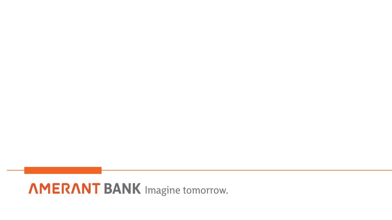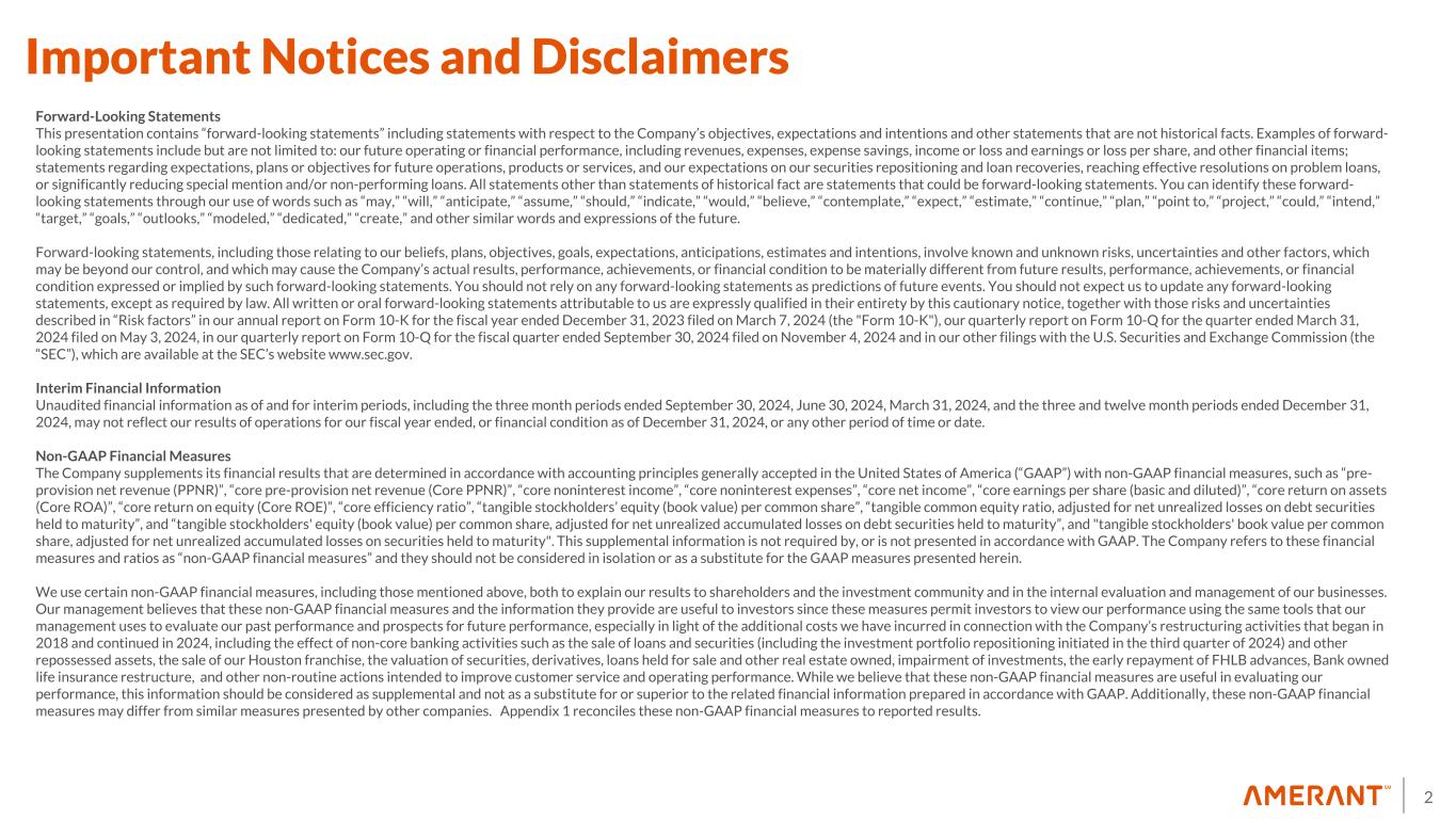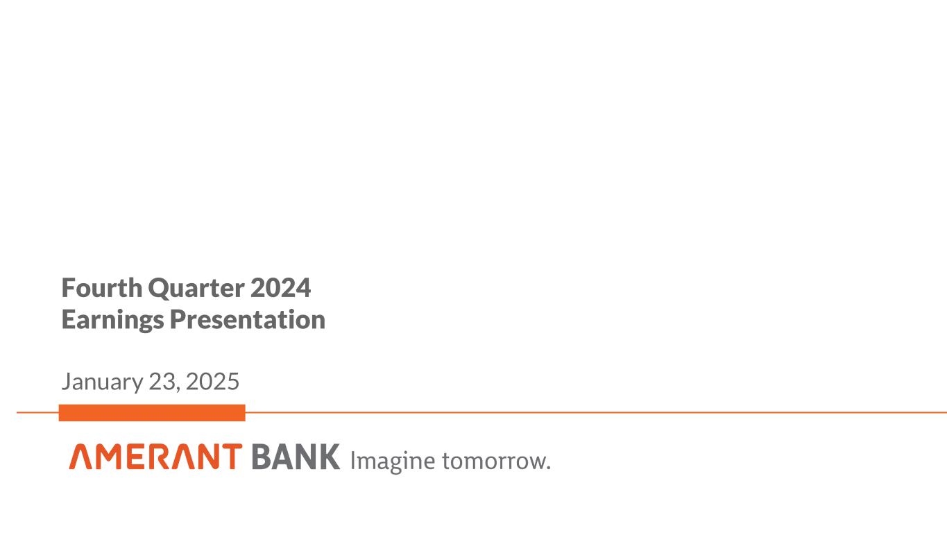 33 Appendix 1 Non-GAAP Financial Measures Reconciliations (cont'd) (1) Includes provision for credit losses on loans and provision for loan contingencies. See footnote 6 in Exhibit 1 - Selected Financial Information in the Earnings Release for more details. (2) In the third quarter of 2024, the Company executed an investment portfolio repositioning which resulted in a total pre-tax net loss of $68.5 million during the same period. The investment portfolio repositioning was completed in early October 2024 resulting in an additional $8.1 million in losses in the fourth quarter of 2024. (3) In the fourth quarter of 2023, the Company completed a restructuring of its bank-owned life insurance (“BOLI”) program. This was executed through a combination of a 1035 exchange and a surrender and reinvestment into higher-yielding general account with a new investment grade insurance carrier. This transaction allowed for higher team member participation through an enhanced split-dollar plan. Estimated improved yields resulting from the enhancement have an earn-back period of approximately 2 years. In the fourth quarter of 2023, we recorded total additional expenses and charges of $4.6 million in connection with this transaction, including: (i) a reduction of $0.7 million to the cash surrender value of BOLI; (ii) transaction costs of $1.1 million, and (iii) income tax expense of $2.8 million. (4) Expenses incurred for actions designed to implement the Company’s business strategy. These actions include, but are not limited to reductions in workforce, streamlining operational processes, promoting the Amerant brand, implementation of new technology system applications, decommissioning of legacy technologies, enhanced sales tools and training, expanded product offerings and improved customer analytics to identify opportunities. (5) Staff reduction costs consist of severance expenses related to organizational rationalization. (6) Contract termination and related costs associated with third party vendors resulting from the Company’s engagement of FIS. (7) In the three months and year ended December 31, 2023, includes an aggregate of $1.6 million and $6.4 million, respectively, of nonrecurrent expenses in connection with the engagement of FIS and, to a lesser extent, software expenses related to legacy applications running in parallel to new core banking applications. The transition to FIS was completed in 2023, therefore, there were no significant nonrecurrent expenses in connection with engagement of FIS in all the other periods shown. (8) Includes expenses in connection with the disposition of fixed assets due to the write-off of in-development software in the year ended December 31, 2023. (9) In the year ended December 31, 2023, includes expenses of $0.3 million in connection with the closure of a branch in Houston, Texas in 2023. In addition, in the year ended December 31, 2023, includes $0.9 million of accelerated amortization of leasehold improvements and $0.6 million of right-of-use, or ROU asset impairment, associated with the closure of a branch in Miami, Florida in 2023. Also, in the year ended December 31, 2023, includes $0.5 million of ROU asset impairment associated with the closure of a branch in Houston, Texas in 2023. (10) In the three months and year ended December 31, 2024, includes loss on sale of $12.6 million, including transaction costs, related to the sale of a portfolio of 323 business-purpose, investment property, residential mortgage loans with a balance of approximately $71.4 million. In each of the three months and year ended December 31, 2023, includes: (i) a fair value adjustment of $35.5 million related to an aggregate of $401 million in Houston- based CRE loans held for sale which are carried at the lower of fair value or cost, and (ii) a loss on sale of $2.0 million related to a New York-based CRE loan previously carried at the lower of fair value or cost. In the year ended December 31, 2023, includes a fair value adjustment of $5.6 million related to a New York-based CRE loan held for sale carried at the lower of fair value or cost. (11) In the three months and year ended ended December 31, 2024, amounts shown are in connection with the Houston Transaction. (12) In the year ended December 31, 2023, amount represents the loss on sale of repossessed assets in connection with our equipment-financing activities. (13) Related to Houston branches and included as part of occupancy and equipment expenses. See Exhibit 5 in the Earnings Release for additional information. (14) In the year ended December 31, 2024, income tax effect amounts on nonroutine items of noninterest income and expense were calculated using estimated tax rates of 27.14% and 22.50%, respectively. In the year ended December 31, 2023, amounts were calculated using an estimated tax rate of 21.00%. In the three months ended March 31, 2024, amounts were calculated based upon the effective tax rate for the period of 21.50%. For all of the other periods shown, amounts represent the difference between the current and prior period year-to-date tax effect. (15) In the three months and year ended December 31, 2023, per share amounts and percentages were calculated using the after-tax impact of non-routine items in noninterest expense of $34.2 million and $52.3 million, respectively, and BOLI tax impact of $2.8 million in each period. In all other periods shown, per share amounts and percentages were calculated using the after tax impact of non-routine items in noninterest expense. (16) See 2023 Form 10-K for more information on potential dilutive instruments and its impact on diluted earnings per share computation. (17) At December 31, 2024, September 30, 2024, June 30, 2024, March 31, 2024 and December 31, 2023, other intangible assets primarily consist of naming rights of $2.0 million, $2.1 million, $2.3 million, $2.4 million and $2.5 million, respectively, and mortgage servicing rights (“MSRs”) of $1.5 milli