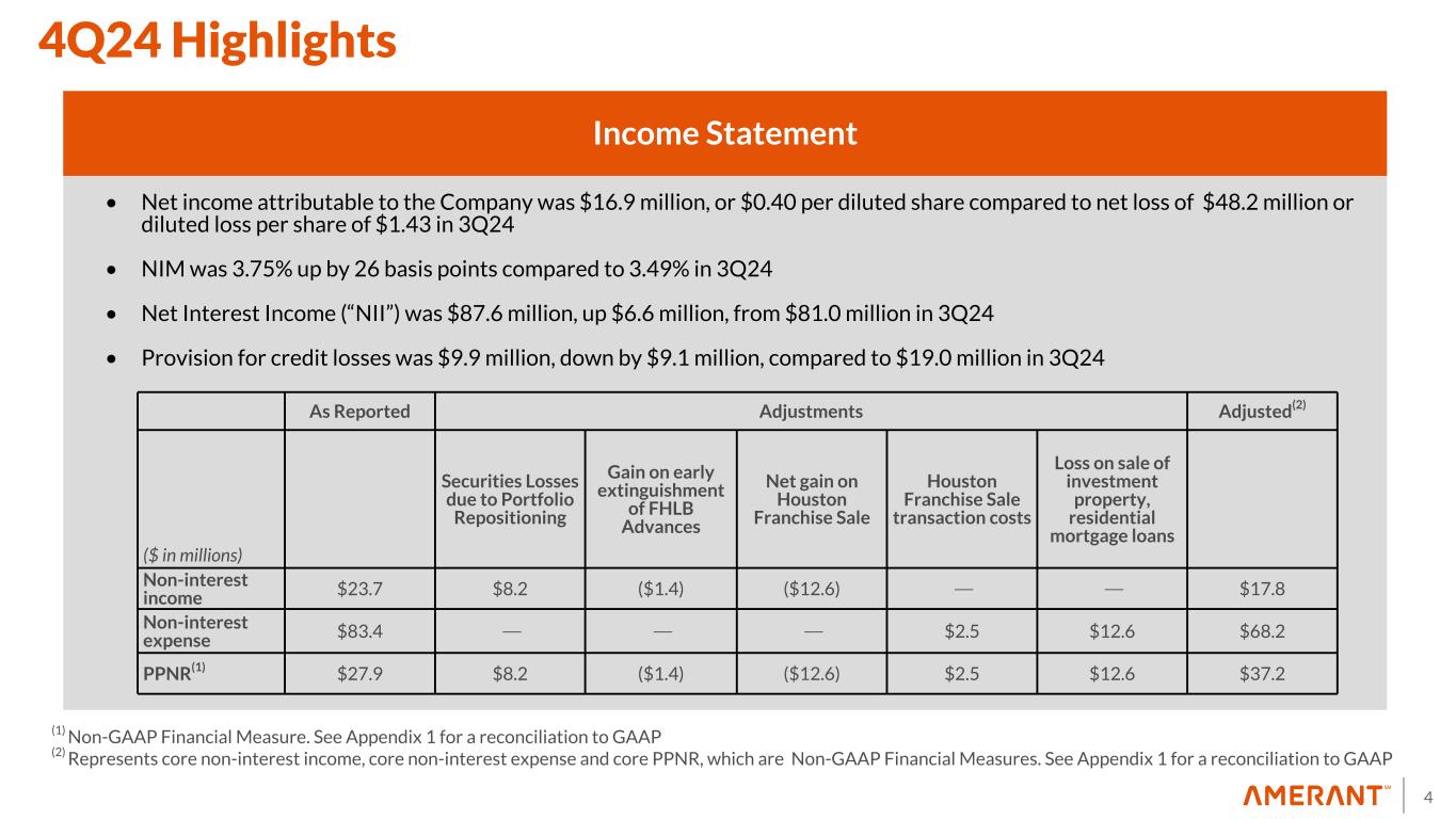 3 4Q24 Highlights Balance Sheet • Total assets were $9.9 billion, down by $455.4 million, compared to $10.4 billion in 3Q24 • Cash and cash and equivalents were $590.4 million, down by $81.5 million, compared to $671.8 million in 3Q24 • Total investments were at $1.50 billion, down by $44.6 million, compared to $1.54 billion in 3Q24 • Total gross loans were $7.3 billion, down by $294.7 million, compared to $7.6 billion in 3Q24; excluding the sale of the Houston franchise and the pool of business-purpose, investment property, residential mortgage loans, 4Q loan growth was $255 million • Total deposits were $7.9 billion, down by $256.9 million, compared to $8.1 billion in 3Q24; excluding the sale of the Houston franchise, 4Q deposits were up by $317 million • FHLB advances were $745.0 million, down by $170.0 million, compared to $915.0 million in 3Q24 • Total Capital Ratio was 13.43% compared to 12.72% in 3Q24 • CET 1 was 11.21% compared to 10.65% in 3Q24 • Tier 1 Capital Ratio was 11.95% compared to 11.36% in 3Q24 • TCE Ratio(1) was 8.77% compared to 8.51% in 3Q24 (1) Non-GAAP Financial Measure. See Appendix 1 for a reconciliation to GAAP