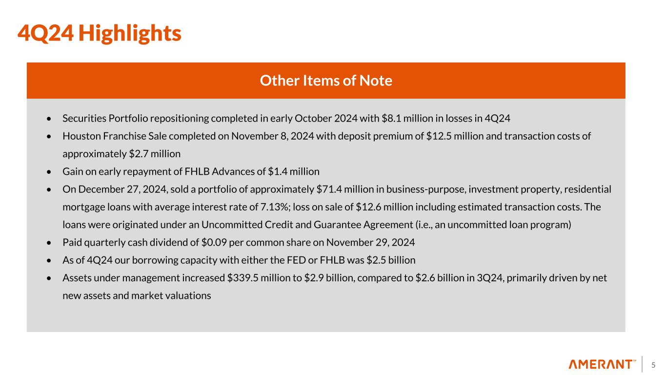 4 4Q24 Highlights Income Statement • Net income attributable to the Company was $16.9 million, or $0.40 per diluted share compared to net loss of $48.2 million or diluted loss per share of $1.43 in 3Q24 • NIM was 3.75% up by 26 basis points compared to 3.49% in 3Q24 • Net Interest Income (“NII”) was $87.6 million, up $6.6 million, from $81.0 million in 3Q24 • Provision for credit losses was $9.9 million, down by $9.1 million, compared to $19.0 million in 3Q24 (1) Non-GAAP Financial Measure. See Appendix 1 for a reconciliation to GAAP (2) Represents core non-interest income, core non-interest expense and core PPNR, which are Non-GAAP Financial Measures. See Appendix 1 for a reconciliation to GAAP As Reported Adjustments Adjusted(2) ($ in millions) Securities Losses due to Portfolio Repositioning Gain on early extinguishment of FHLB Advances Net gain on Houston Franchise Sale Houston Franchise Sale transaction costs Loss on sale of investment property, residential mortgage loans Non-interest income $23.7 $8.2 ($1.4) ($12.6) — — $17.8 Non-interest expense $83.4 — — — $2.5 $12.6 $68.2 PPNR(1) $27.9 $8.2 ($1.4) ($12.6) $2.5 $12.6 $37.2
