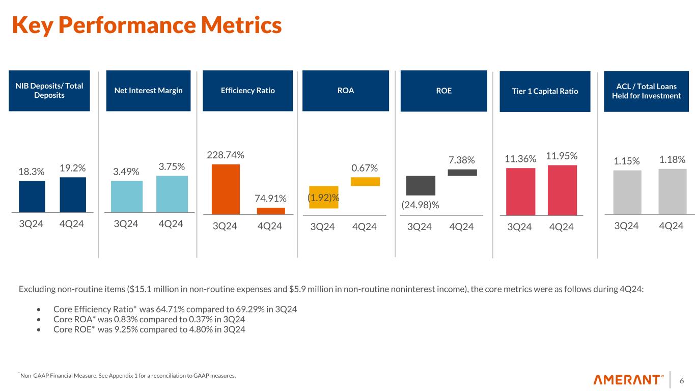 5 4Q24 Highlights Other Items of Note • Securities Portfolio repositioning completed in early October 2024 with $8.1 million in losses in 4Q24 • Houston Franchise Sale completed on November 8, 2024 with deposit premium of $12.5 million and transaction costs of approximately $2.7 million • Gain on early repayment of FHLB Advances of $1.4 million • On December 27, 2024, sold a portfolio of approximately $71.4 million in business-purpose, investment property, residential mortgage loans with average interest rate of 7.13%; loss on sale of $12.6 million including estimated transaction costs. The loans were originated under an Uncommitted Credit and Guarantee Agreement (i.e., an uncommitted loan program) • Paid quarterly cash dividend of $0.09 per common share on November 29, 2024 • As of 4Q24 our borrowing capacity with either the FED or FHLB was $2.5 billion • Assets under management increased $339.5 million to $2.9 billion, compared to $2.6 billion in 3Q24, primarily driven by net new assets and market valuations