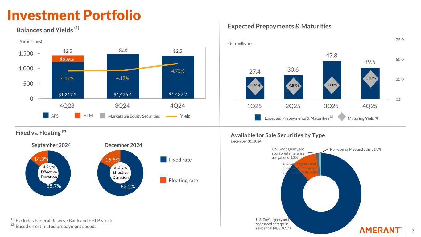 6 228.74% 74.91% 3Q24 4Q24 18.3% 19.2% 3Q24 4Q24 11.36% 11.95% 3Q24 4Q24 3.49% 3.75% 3Q24 4Q24 NIB Deposits/ Total Deposits Tier 1 Capital RatioNet Interest Margin Efficiency Ratio 1.15% 1.18% 3Q24 4Q24 ACL / Total Loans Held for Investment (1.92)% 0.67% 3Q24 4Q24 ROA (24.98)% 7.38% 3Q24 4Q24 Excluding non-routine items ($15.1 million in non-routine expenses and $5.9 million in non-routine noninterest income), the core metrics were as follows during 4Q24: • Core Efficiency Ratio* was 64.71% compared to 69.29% in 3Q24 • Core ROA* was 0.83% compared to 0.37% in 3Q24 • Core ROE* was 9.25% compared to 4.80% in 3Q24 ROE Key Performance Metrics * Non-GAAP Financial Measure. See Appendix 1 for a reconciliation to GAAP measures.