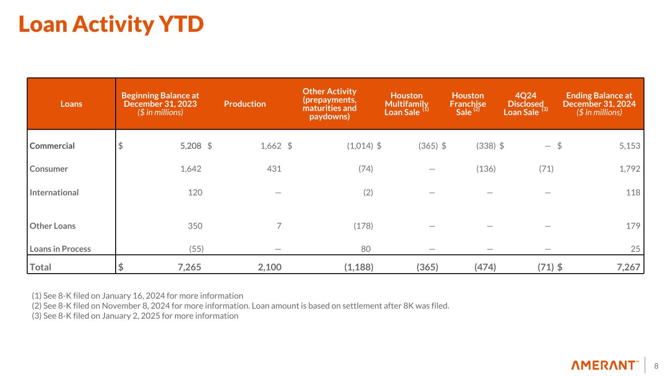 7 83.2% 16.8% U.S. Gov't agency and sponsored enterprise residential MBS; 87.9% U.S. Gov't agency and sponsored enterprise commercial MBS; 9.9% U.S. Gov't agency and sponsored enterprise obligations; 1.2% Non-agency MBS and other; 1.0% $1,217.5 $1,476.4 $1,437.2 $226.6 $—$2.5 $2.6 $2.5 4.17% 4.19% 4.73% 4Q23 3Q24 4Q24 0 500 1,000 1,500 85.7% 14.3% Balances and Yields (1) AFS HTM Fixed vs. Floating (2) September 2024 December 2024 Floating rate Fixed rate Available for Sale Securities by Type December 31, 2024 4.9 yrs Effective Duration ($ in millions) Marketable Equity Securities (1) Excludes Federal Reserve Bank and FHLB stock (2) Based on estimated prepayment speeds Yield 5.2 yrs Effective Duration 27.4 30.6 47.8 39.5 1Q25 2Q25 3Q25 4Q25 0.0 25.0 50.0 75.0 ($ in millions) Expected Prepayments & Maturities Expected Prepayments & Maturities (3) Maturing Yield % Investment Portfolio 4.74% 4.89% 4.88% 5.07%