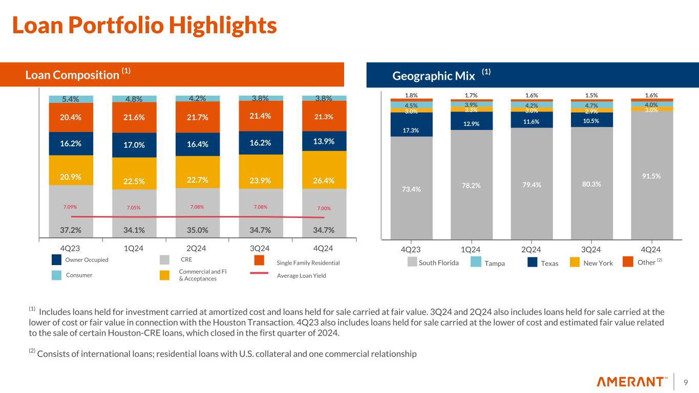 8 Loan Activity YTD Loans Beginning Balance at December 31, 2023 ($ in millions) Production Other Activity (prepayments, maturities and paydowns) Houston Multifamily Loan Sale (1) Houston Franchise Sale (2) 4Q24 Disclosed Loan Sale (3) Ending Balance at December 31, 2024 ($ in millions) Commercial $ 5,208 $ 1,662 $ (1,014) $ (365) $ (338) $ — $ 5,153 Consumer 1,642 431 (74) — (136) (71) 1,792 International 120 — (2) — — — 118 Other Loans 350 7 (178) — — — 179 Loans in Process (55) — 80 — — — 25 Total $ 7,265 2,100 (1,188) (365) (474) (71) $ 7,267 (1) See 8-K filed on January 16, 2024 for more information (2) See 8-K filed on November 8, 2024 for more information. Loan amount is based on settlement after 8K was filed. (3) See 8-K filed on January 2, 2025 for more information