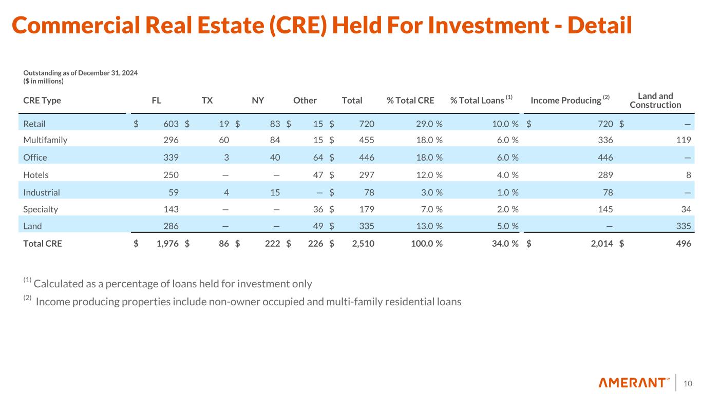 9 37.2% 34.1% 35.0% 34.7% 34.7% 20.9% 22.5% 22.7% 23.9% 26.4% 16.2% 17.0% 16.4% 16.2% 13.9% 20.4% 21.6% 21.7% 21.4% 21.3% 5.4% 4.8% 4.2% 3.8% 3.8% 7.09% 7.05% 7.08% 7.08% 7.00% 4Q23 1Q24 2Q24 3Q24 4Q24 73.4% 78.2% 79.4% 80.3% 91.5% 17.3% 12.9% 11.6% 10.5% 3.0% 3.3% 3.0% 2.9% 3.0% 4.5% 3.9% 4.2% 4.7% 4.0% 1.8% 1.7% 1.6% 1.5% 1.6% 4Q23 1Q24 2Q24 3Q24 4Q24 Consumer CRE Commercial and FI & Acceptances Owner Occupied Single Family Residential Loan Composition (1) Geographic Mix (Domestic) Geographic ix (1) South Florida Texas New York Average Loan Yield Other (2) (1) Includes loans held for investment carried at amortized cost and loans held for sale carried at fair value. 3Q24 and 2Q24 also includes loans held for sale carried at the lower of cost or fair value in connection with the Houston Transaction. 4Q23 also includes loans held for sale carried at the lower of cost and estimated fair value related to the sale of certain Houston-CRE loans, which closed in the first quarter of 2024. (2) Consists of international loans; residential loans with U.S. collateral and one commercial relationship Tampa Loan Portfolio Highlights