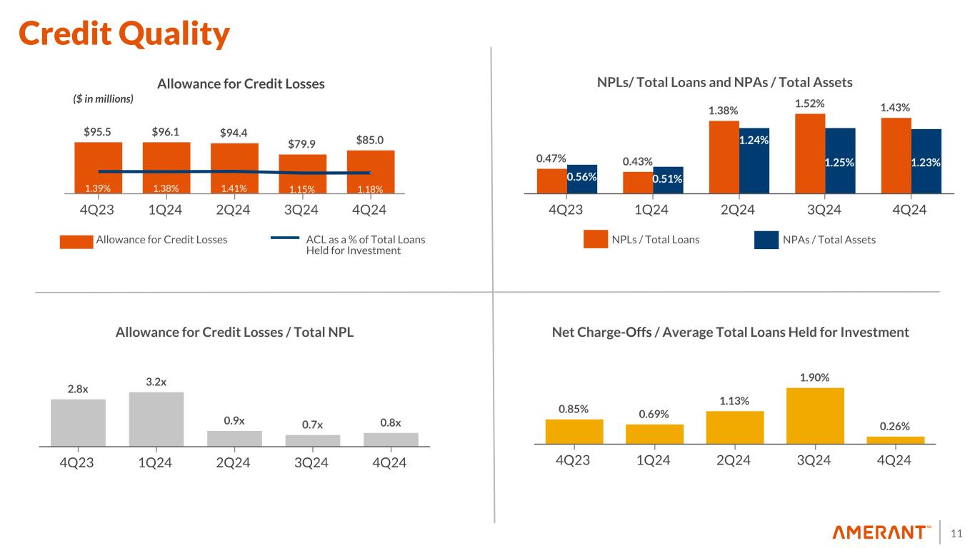 10 CRE Type FL TX NY Other Total % Total CRE % Total Loans (1) Income Producing (2) Land and Construction Retail $ 603 $ 19 $ 83 $ 15 $ 720 29.0 % 10.0 % $ 720 $ — Multifamily 296 60 84 15 $ 455 18.0 % 6.0 % 336 119 Office 339 3 40 64 $ 446 18.0 % 6.0 % 446 — Hotels 250 — — 47 $ 297 12.0 % 4.0 % 289 8 Industrial 59 4 15 — $ 78 3.0 % 1.0 % 78 — Specialty 143 — — 36 $ 179 7.0 % 2.0 % 145 34 Land 286 — — 49 $ 335 13.0 % 5.0 % — 335 Total CRE $ 1,976 $ 86 $ 222 $ 226 $ 2,510 100.0 % 34.0 % $ 2,014 $ 496 Outstanding as of December 31, 2024 ($ in millions) (1) Calculated as a percentage of loans held for investment only (2) Income producing properties include non-owner occupied and multi-family residential loans Commercial Real Estate (CRE) Held For Investment - Detail