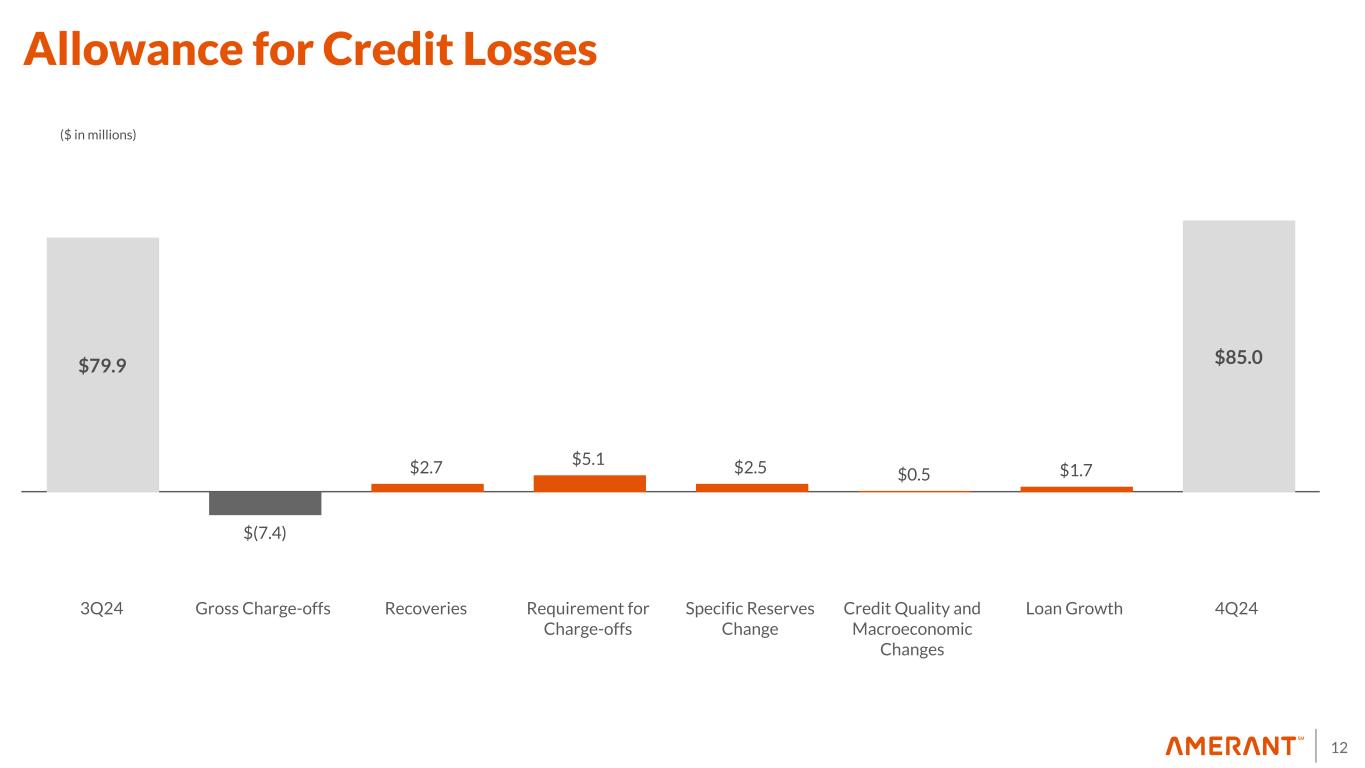 11 0.47% 0.43% 1.38% 1.52% 1.43% 0.56% 0.51% 1.24% 1.25% 1.23% 4Q23 1Q24 2Q24 3Q24 4Q24 2.8x 3.2x 0.9x 0.7x 0.8x 4Q23 1Q24 2Q24 3Q24 4Q24 $95.5 $96.1 $94.4 $79.9 $85.0 1.39% 1.38% 1.41% 1.15% 1.18% 4Q23 1Q24 2Q24 3Q24 4Q24 0.85% 0.69% 1.13% 1.90% 0.26% 4Q23 1Q24 2Q24 3Q24 4Q24 Net Charge-Offs / Average Total Loans Held for Investment Allowance for Credit Losses ($ in millions) NPLs/ Total Loans and NPAs / Total Assets Allowance for Credit Losses / Total NPL Allowance for Credit Losses ACL as a % of Total Loans Held for Investment NPLs / Total Loans NPAs / Total Assets Credit Quality