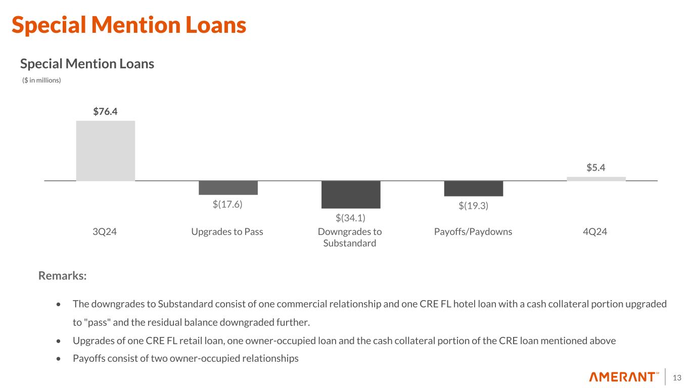 12 $79.9 $(7.4) $2.7 $5.1 $2.5 $0.5 $1.7 $85.0 3Q24 Gross Charge-offs Recoveries Requirement for Charge-offs Specific Reserves Change Credit Quality and Macroeconomic Changes Loan Growth 4Q24 ($ in millions) Allowance for Credit Losses