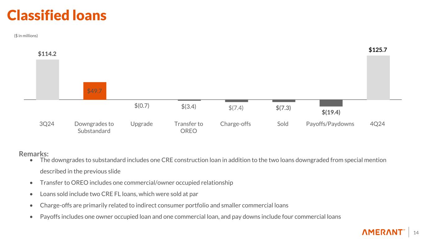13 Special Mention Loans $76.4 $(17.6) $(34.1) $(19.3) $5.4 3Q24 Upgrades to Pass Downgrades to Substandard Payoffs/Paydowns 4Q24 ($ in millions) Special Mention Loans Remarks: • The downgrades to Substandard consist of one commercial relationship and one CRE FL hotel loan with a cash collateral portion upgraded to "pass" and the residual balance downgraded further. • Upgrades of one CRE FL retail loan, one owner-occupied loan and the cash collateral portion of the CRE loan mentioned above • Payoffs consist of two owner-occupied relationships