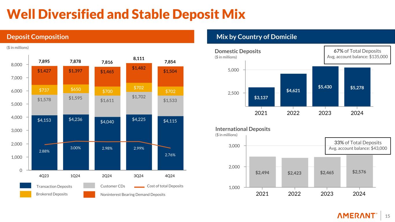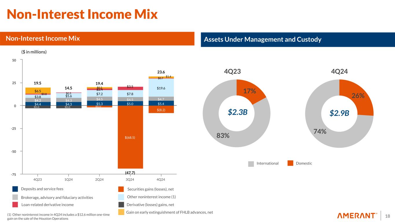 18 19.5 14.5 19.4 23.6 (47.7) $4.4 $4.3 $5.3 $5.0 $5.4 $4.2 $4.3 $4.5 $4.5 $4.7 $(68.5) $(8.2) $3.8 $5.6 $7.2 $7.8 $19.6 $0.5 $2.4 $3.5 $6.5 4Q23 1Q24 2Q24 3Q24 4Q24 -75 -50 -25 0 25 50 17% 83% 26% 74% Non-Interest Income Mix Deposits and service fees Brokerage, advisory and fiduciary activities Other noninterest income (1) DomesticInternational 4Q23 $2.9B ($ in millions) Securities gains (losses), net Loan-related derivative income Derivative (losses) gains, net Gain on early extinguishment of FHLB advances, net Non-Interest Income Mix $2.3B Assets Under Management and Custody 4Q24 (1) Other noninterest income in 4Q24 includes a $12.6 million one-time gain on the sale of the Houston Operations $0.2 $(0.2) $(0.1) $(0.2) $1.4 $0.7 $0.8