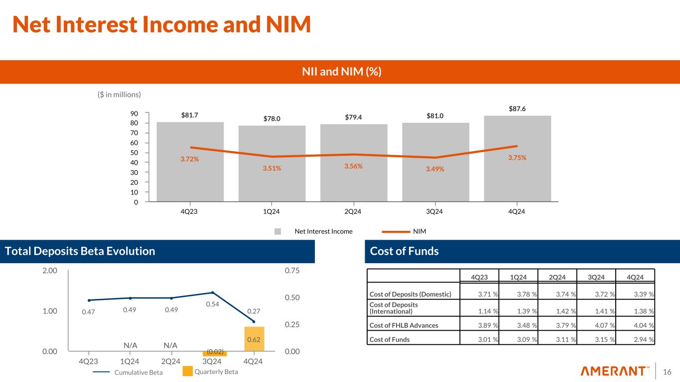 15 7,895 7,878 7,816 8,111 7,854 $4,153 $4,236 $4,040 $4,225 $4,115 $1,578 $1,595 $1,611 $1,702 $1,533 $737 $650 $700 $702 $702 $1,427 $1,397 $1,465 $1,482 $1,504 2.88% 3.00% 2.98% 2.99% 2.76% 4Q23 1Q24 2Q24 3Q24 4Q24 0 1,000 2,000 3,000 4,000 5,000 6,000 7,000 8,000 $2,494 $2,423 $2,465 $2,576 2021 2022 2023 2024 1,000 2,000 3,000 $3,137 $4,621 $5,430 $5,278 2021 2022 2023 2024 2,500 5,000 Domestic Deposits ($ in millions) Deposit Composition International Deposits ($ in millions) Mix by Country of Domicile Transaction Deposits Customer CDs Brokered Deposits Cost of total Deposits ($ in millions) Noninterest Bearing Demand Deposits 33% of Total Deposits Avg. account balance: $43,000 67% of Total Deposits Avg. account balance: $135,000 Well Diversified and Stable Deposit Mix