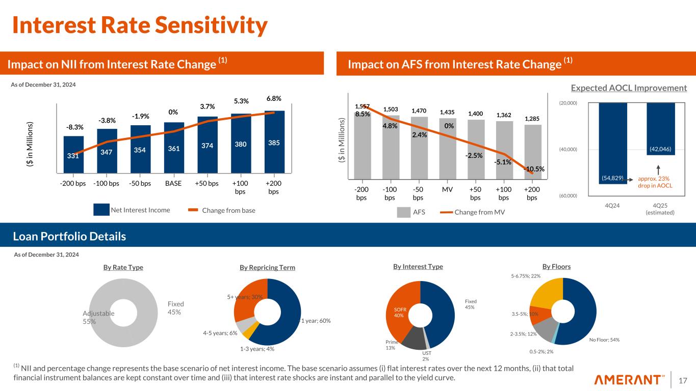 16 $81.7 $78.0 $79.4 $81.0 $87.6 3.72% 3.51% 3.56% 3.49% 3.75% Net Interest Income NIM 4Q23 1Q24 2Q24 3Q24 4Q24 0 10 20 30 40 50 60 70 80 90 NII and NIM (%) 16 ($ in millions) 4Q23 1Q24 2Q24 3Q24 4Q24 Cost of Deposits (Domestic) 3.71 % 3.78 % 3.74 % 3.72 % 3.39 % Cost of Deposits (International) 1.14 % 1.39 % 1.42 % 1.41 % 1.38 % Cost of FHLB Advances 3.89 % 3.48 % 3.79 % 4.07 % 4.04 % Cost of Funds 3.01 % 3.09 % 3.11 % 3.15 % 2.94 %0.62 0.47 0.49 0.49 0.54 0.27 4Q23 1Q24 2Q24 3Q24 4Q24 0.00 1.00 2.00 0.00 0.25 0.50 0.75 Quarterly BetaCumulative Beta Net Interest Income and NIM Total Deposits Beta Evolution Cost of Funds N/A N/A (0.02)