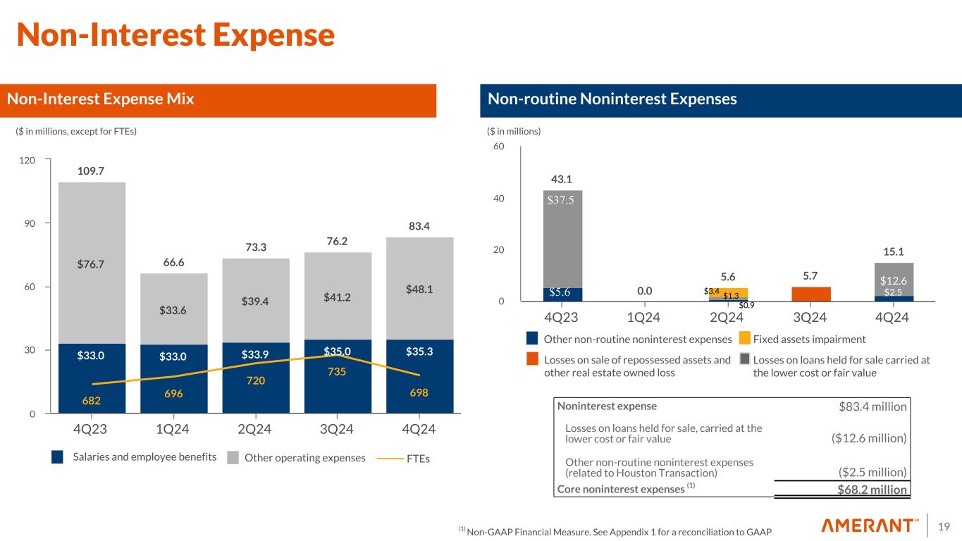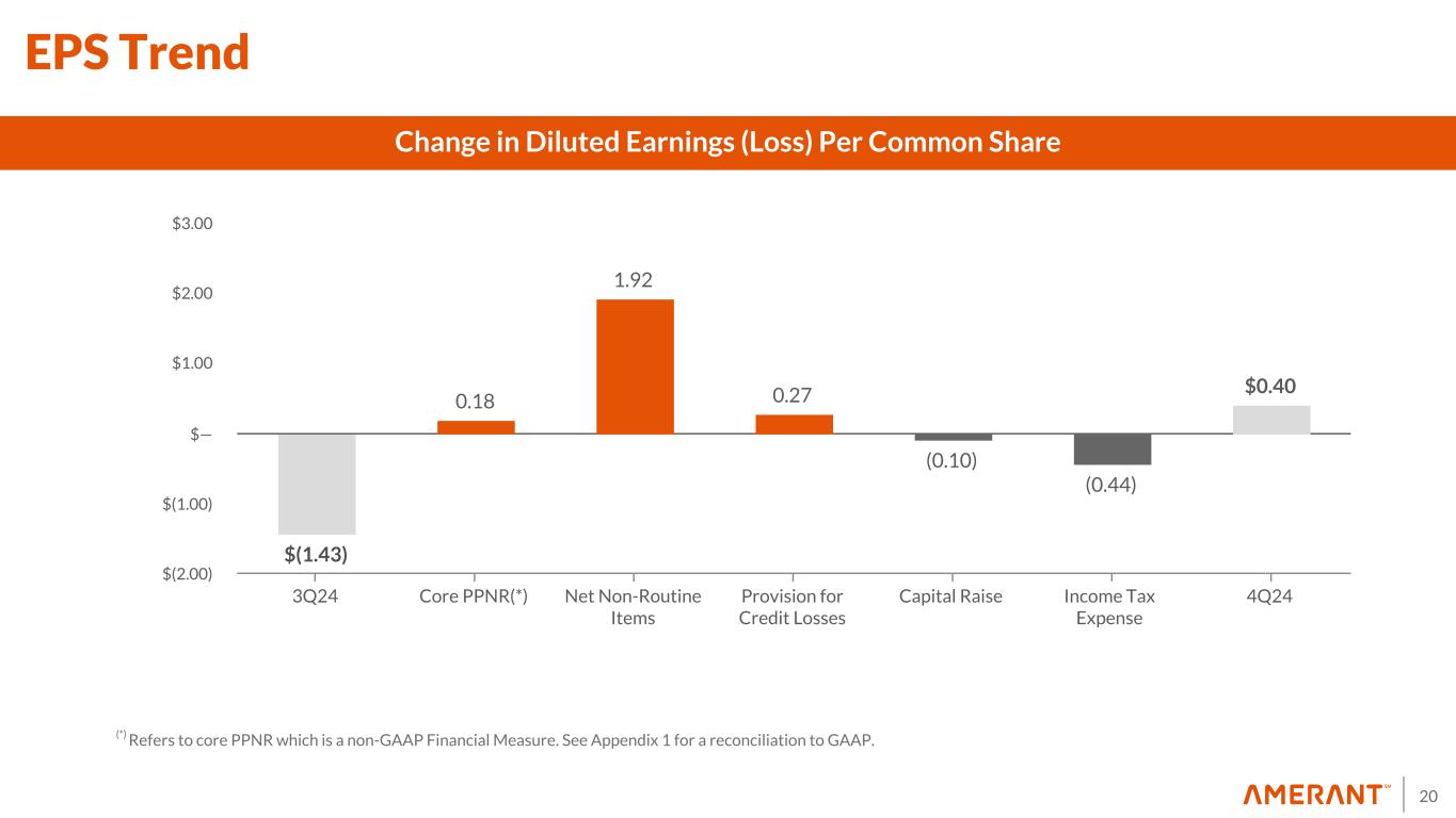 19 109.7 66.6 73.3 76.2 83.4 $33.0 $33.0 $33.9 $35.0 $35.3 $76.7 $33.6 $39.4 $41.2 $48.1 682 696 720 735 698 4Q23 1Q24 2Q24 3Q24 4Q24 0 30 60 90 120 Non-Interest Expense Mix ($ in millions, except for FTEs) Non-routine Noninterest Expenses 43.1 0.0 5.6 5.7 15.1 $2.5 $— $12.6 4Q23 1Q24 2Q24 3Q24 4Q24 0 20 40 60 ($ in millions) Non-Interest Expense Salaries and employee benefits Other operating expenses FTEs Other non-routine noninterest expenses Fixed assets impairment Losses on sale of repossessed assets and other real estate owned loss $37.5 $5.6 $3.4 $1.3 $0.9 Losses on loans held for sale carried at the lower cost or fair value Noninterest expense $83.4 million Losses on loans held for sale, carried at the lower cost or fair value ($12.6 million) Other non-routine noninterest expenses (related to Houston Transaction) ($2.5 million) Core noninterest expenses (1) $68.2 million (1) Non-GAAP Financial Measure. See Appendix 1 for a reconciliation to GAAP