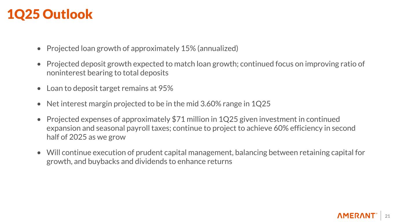 20 Change in Diluted Earnings (Loss) Per Common Share $(1.43) 0.18 1.92 0.27 (0.10) (0.44) $0.40 3Q24 Core PPNR(*) Net Non-Routine Items Provision for Credit Losses Capital Raise Income Tax Expense 4Q24 $(2.00) $(1.00) $— $1.00 $2.00 $3.00 EPS Trend (*) Refers to core PPNR which is a non-GAAP Financial Measure. See Appendix 1 for a reconciliation to GAAP.