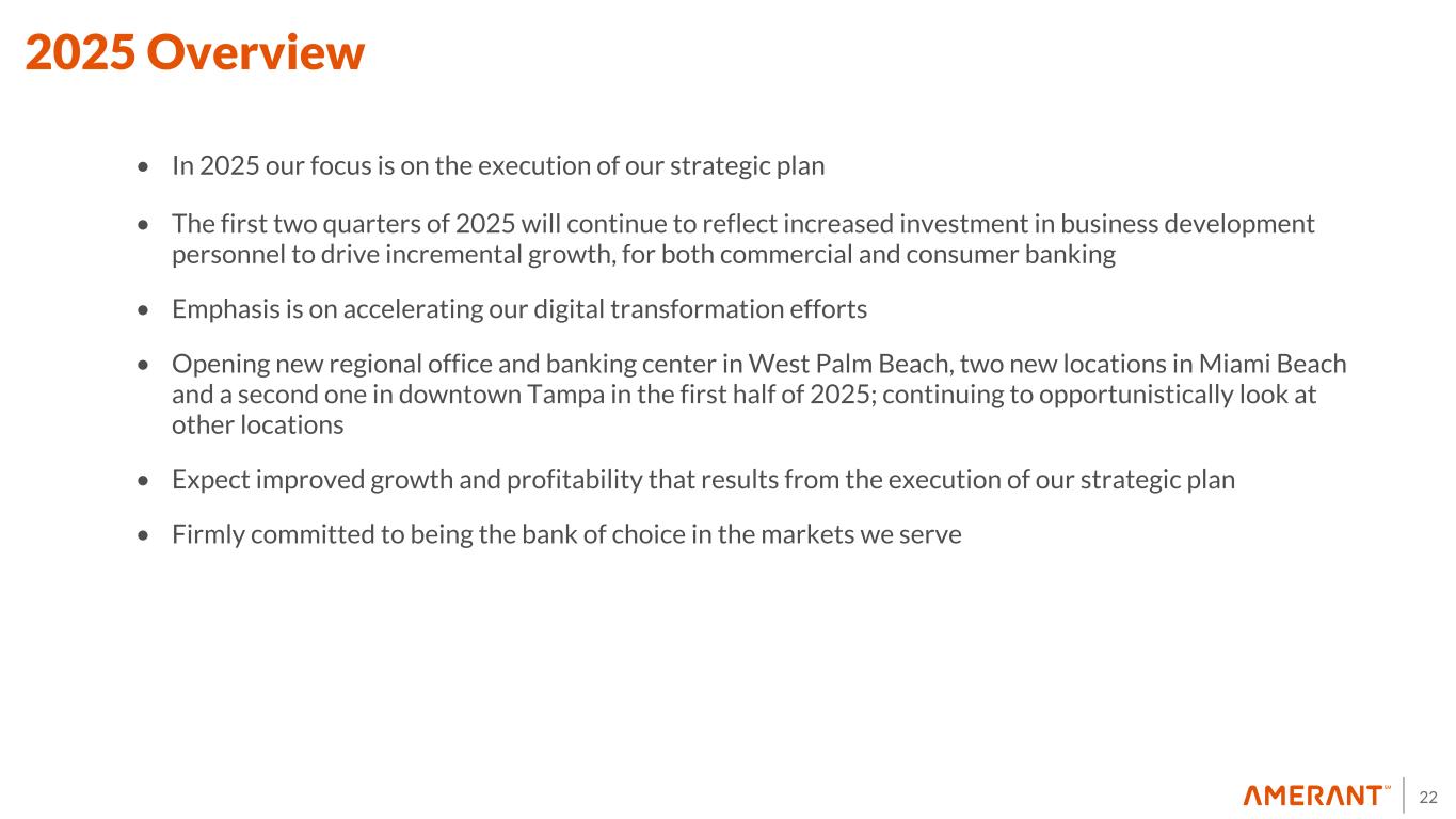 21 • Projected loan growth of approximately 15% (annualized) • Projected deposit growth expected to match loan growth; continued focus on improving ratio of noninterest bearing to total deposits • Loan to deposit target remains at 95% • Net interest margin projected to be in the mid 3.60% range in 1Q25 • Projected expenses of approximately $71 million in 1Q25 given investment in continued expansion and seasonal payroll taxes; continue to project to achieve 60% efficiency in second half of 2025 as we grow • Will continue execution of prudent capital management, balancing between retaining capital for growth, and buybacks and dividends to enhance returns 1Q25 Outlook
