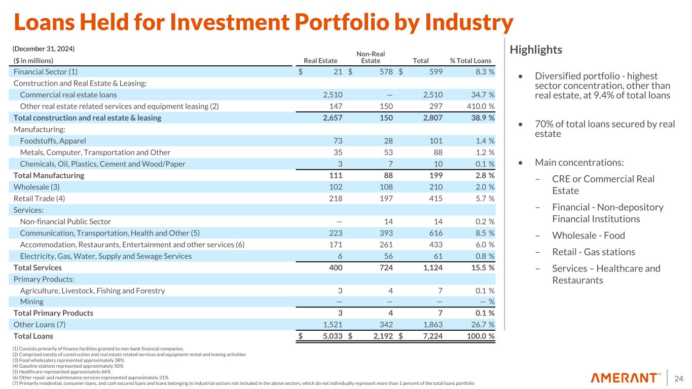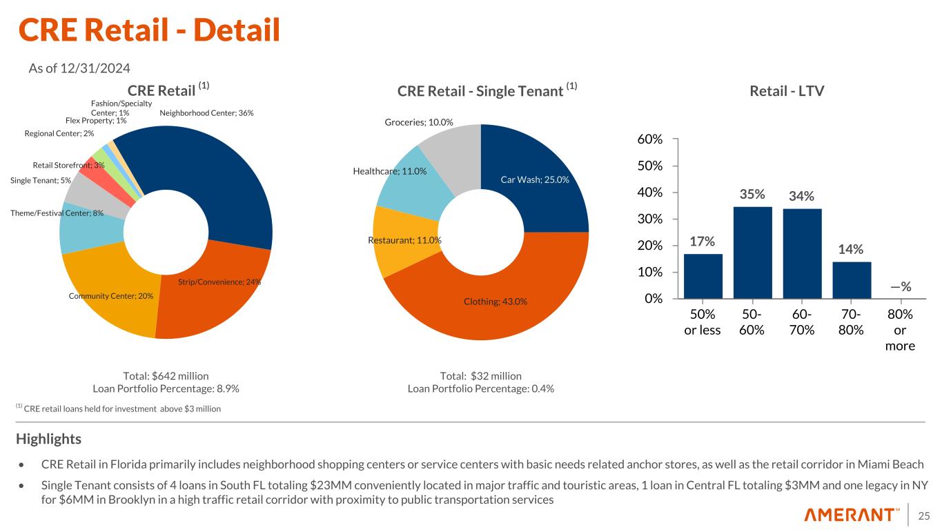 24 Loans Held for Investment Portfolio by Industry • Diversified portfolio - highest sector concentration, other than real estate, at 9.4% of total loans • 70% of total loans secured by real estate • Main concentrations: – CRE or Commercial Real Estate – Financial - Non-depository Financial Institutions – Wholesale - Food – Retail - Gas stations – Services – Healthcare and Restaurants Highlights (1) Consists primarily of finance facilities granted to non-bank financial companies. (2) Comprised mostly of construction and real estate related services and equipment rental and leasing activities (3) Food wholesalers represented approximately 38% (4) Gasoline stations represented approximately 50% (5) Healthcare represented approximately 66% (6) Other repair and maintenance services represented approximately 31% (7) Primarily residential, consumer loans, and cash secured loans and loans belonging to industrial sectors not included in the above sectors, which do not individually represent more than 1 percent of the total loans portfolio ($ in millions) Real Estate Non-Real Estate Total % Total Loans Financial Sector (1) $ 21 $ 578 $ 599 8.3 % Construction and Real Estate & Leasing: Commercial real estate loans 2,510 — 2,510 34.7 % Other real estate related services and equipment leasing (2) 147 150 297 410.0 % Total construction and real estate & leasing 2,657 150 2,807 38.9 % Manufacturing: Foodstuffs, Apparel 73 28 101 1.4 % Metals, Computer, Transportation and Other 35 53 88 1.2 % Chemicals, Oil, Plastics, Cement and Wood/Paper 3 7 10 0.1 % Total Manufacturing 111 88 199 2.8 % Wholesale (3) 102 108 210 2.0 % Retail Trade (4) 218 197 415 5.7 % Services: Non-financial Public Sector — 14 14 0.2 % Communication, Transportation, Health and Other (5) 223 393 616 8.5 % Accommodation, Restaurants, Entertainment and other services (6) 171 261 433 6.0 % Electricity, Gas, Water, Supply and Sewage Services 6 56 61 0.8 % Total Services 400 724 1,124 15.5 % Primary Products: Agriculture, Livestock, Fishing and Forestry 3 4 7 0.1 % Mining — — — — % Total Primary Products 3 4 7 0.1 % Other Loans (7) 1,521 342 1,863 26.7 % Total Loans $ 5,033 $ 2,192 $ 7,224 100.0 % (December 31, 2024)