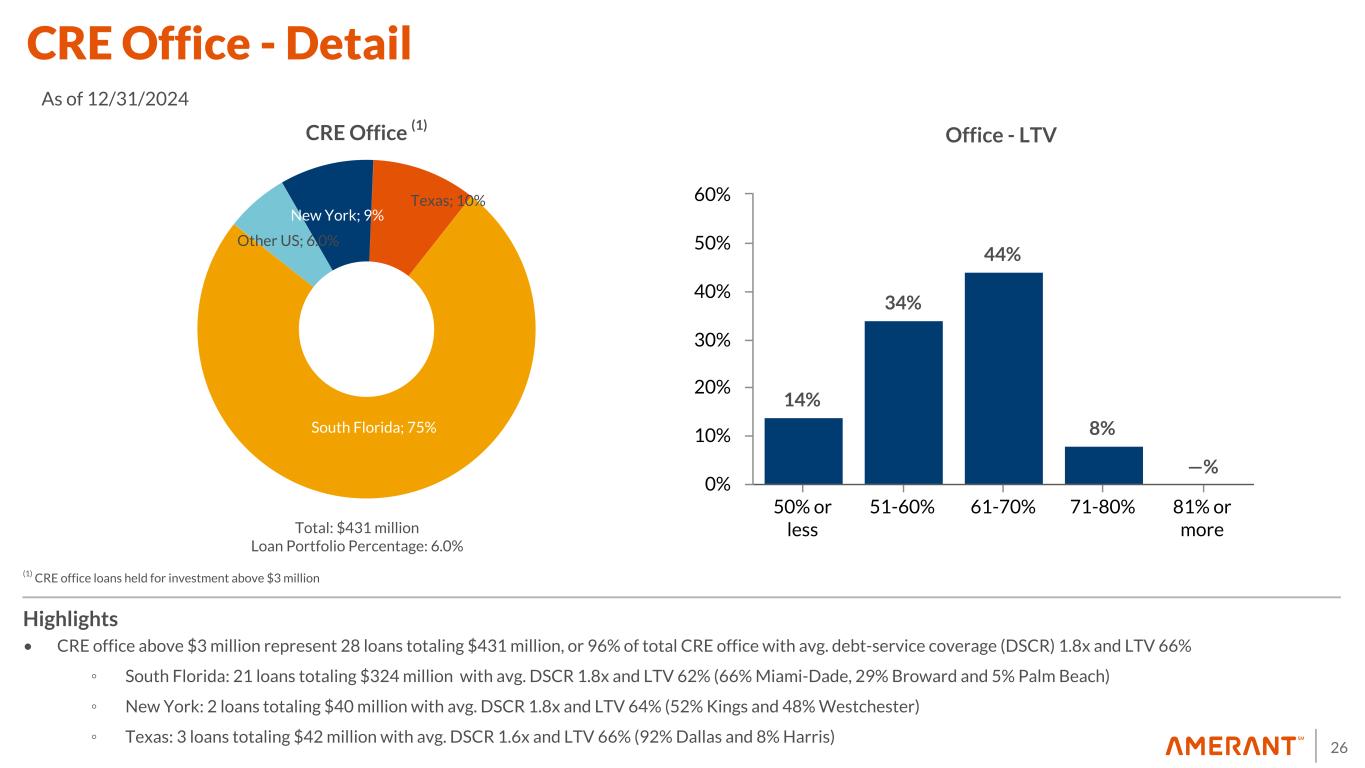 25 17% 35% 34% 14% —% 50% or less 50- 60% 60- 70% 70- 80% 80% or more 0% 10% 20% 30% 40% 50% 60% • CRE Retail in Florida primarily includes neighborhood shopping centers or service centers with basic needs related anchor stores, as well as the retail corridor in Miami Beach • Single Tenant consists of 4 loans in South FL totaling $23MM conveniently located in major traffic and touristic areas, 1 loan in Central FL totaling $3MM and one legacy in NY for $6MM in Brooklyn in a high traffic retail corridor with proximity to public transportation services Highlights CRE Retail (1) Retail - LTV Car Wash; 25.0% Clothing; 43.0% Restaurant; 11.0% Healthcare; 11.0% Groceries; 10.0% CRE Retail - Single Tenant (1) (1) CRE retail loans held for investment above $3 million Total: $642 million Loan Portfolio Percentage: 8.9% Total: $32 million Loan Portfolio Percentage: 0.4% Neighborhood Center; 36% Strip/Convenience; 24% Community Center; 20% Theme/Festival Center; 8% Single Tenant; 5% Retail Storefront; 3% Regional Center; 2% Flex Property; 1% Fashion/Specialty Center; 1% CRE Retail - Detail As of 12/31/2024