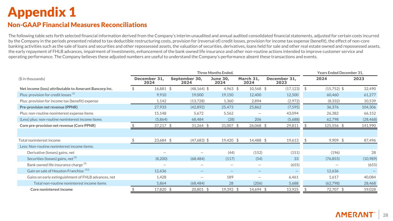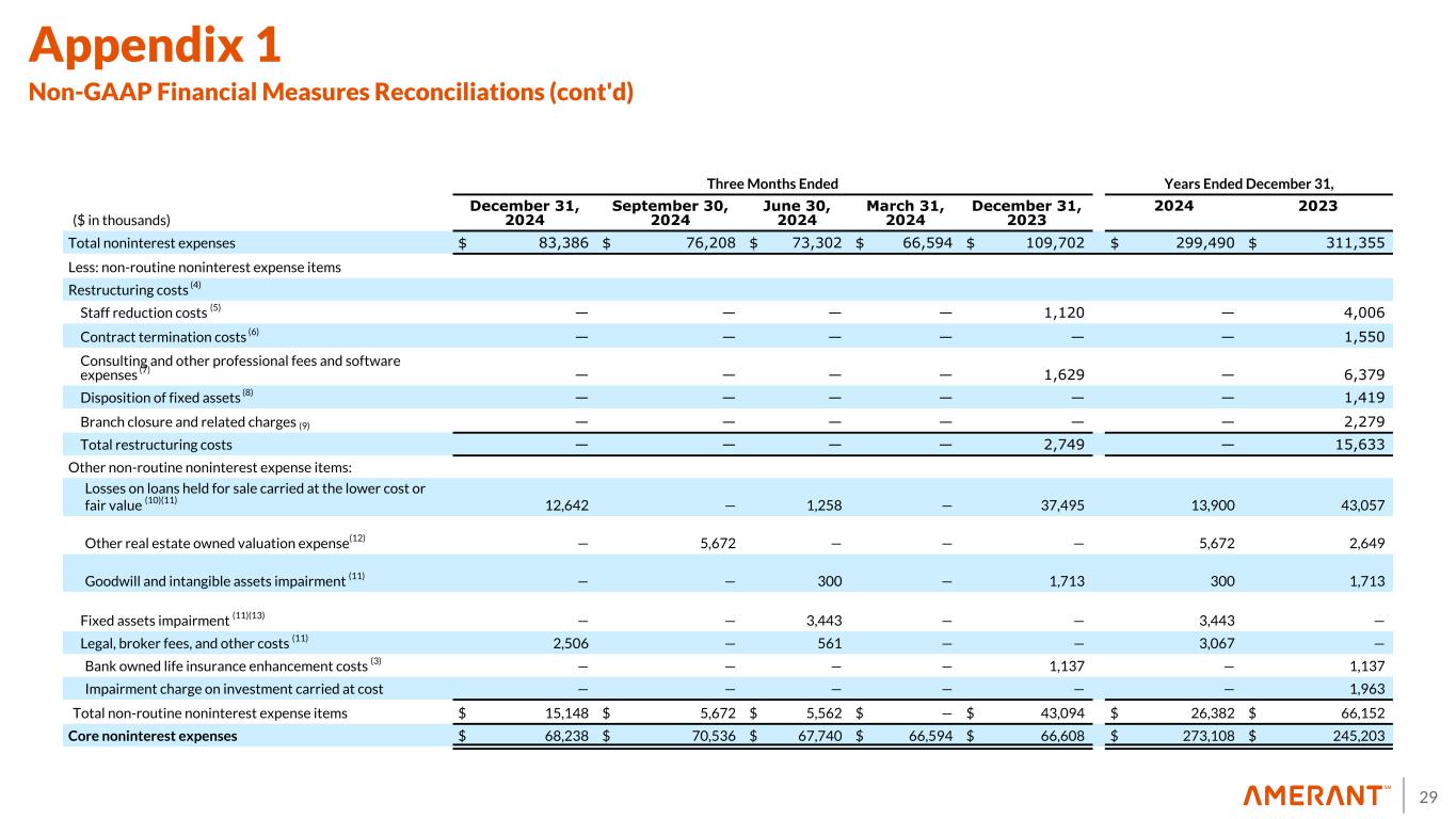 28 Appendix 1 Non-GAAP Financial Measures Reconciliations The following table sets forth selected financial information derived from the Company’s interim unaudited and annual audited consolidated financial statements, adjusted for certain costs incurred by the Company in the periods presented related to tax deductible restructuring costs, provision for (reversal of) credit losses, provision for income tax expense (benefit), the effect of non-core banking activities such as the sale of loans and securities and other repossessed assets, the valuation of securities, derivatives, loans held for sale and other real estate owned and repossessed assets, the early repayment of FHLB advances, impairment of investments, enhancement of the bank owned life insurance and other non-routine actions intended to improve customer service and operating performance. The Company believes these adjusted numbers are useful to understand the Company’s performance absent these transactions and events. Three Months Ended, Years Ended December 31, ($ in thousands) December 31, 2024 September 30, 2024 June 30, 2024 March 31, 2024 December 31, 2023 2024 2023 Net income (loss) attributable to Amerant Bancorp Inc. $ 16,881 $ (48,164) $ 4,963 $ 10,568 $ (17,123) $ (15,752) $ 32,490 Plus: provision for credit losses (1) 9,910 19,000 19,150 12,400 12,500 60,460 61,277 Plus: provision for income tax (benefit) expense 1,142 (13,728) 1,360 2,894 (2,972) (8,332) 10,539 Pre-provision net revenue (PPNR) 27,933 (42,892) 25,473 25,862 (7,595) 36,376 104,306 Plus: non-routine noninterest expense items 15,148 5,672 5,562 — 43,094 26,382 66,152 (Less) plus: non-routine noninterest income items (5,864) 68,484 (28) 206 (5,688) 62,798 (28,468) Core pre-provision net revenue (Core PPNR) $ 37,217 $ 31,264 $ 31,007 $ 26,068 $ 29,811 $ 125,556 $ 141,990 Total noninterest income $ 23,684 $ (47,683) $ 19,420 $ 14,488 $ 19,613 $ 9,909 $ 87,496 Less: Non-routine noninterest income items: Derivative (losses) gains, net — — (44) (152) (151) (196) 28 Securities (losses) gains, net (2) (8,200) (68,484) (117) (54) 33 (76,855) (10,989) Bank owned life insurance charge (3) — — — — (655) — (655) Gain on sale of Houston Franchise (11) 12,636 — — — — 12,636 — Gains on early extinguishment of FHLB advances, net 1,428 — 189 — 6,461 1,617 40,084 Total non-routine noninterest income items 5,864 (68,484) 28 (206) 5,688 (62,798) 28,468 Core noninterest income $ 17,820 $ 20,801 $ 19,392 $ 14,694 $ 13,925 $ 72,707 $ 59,028